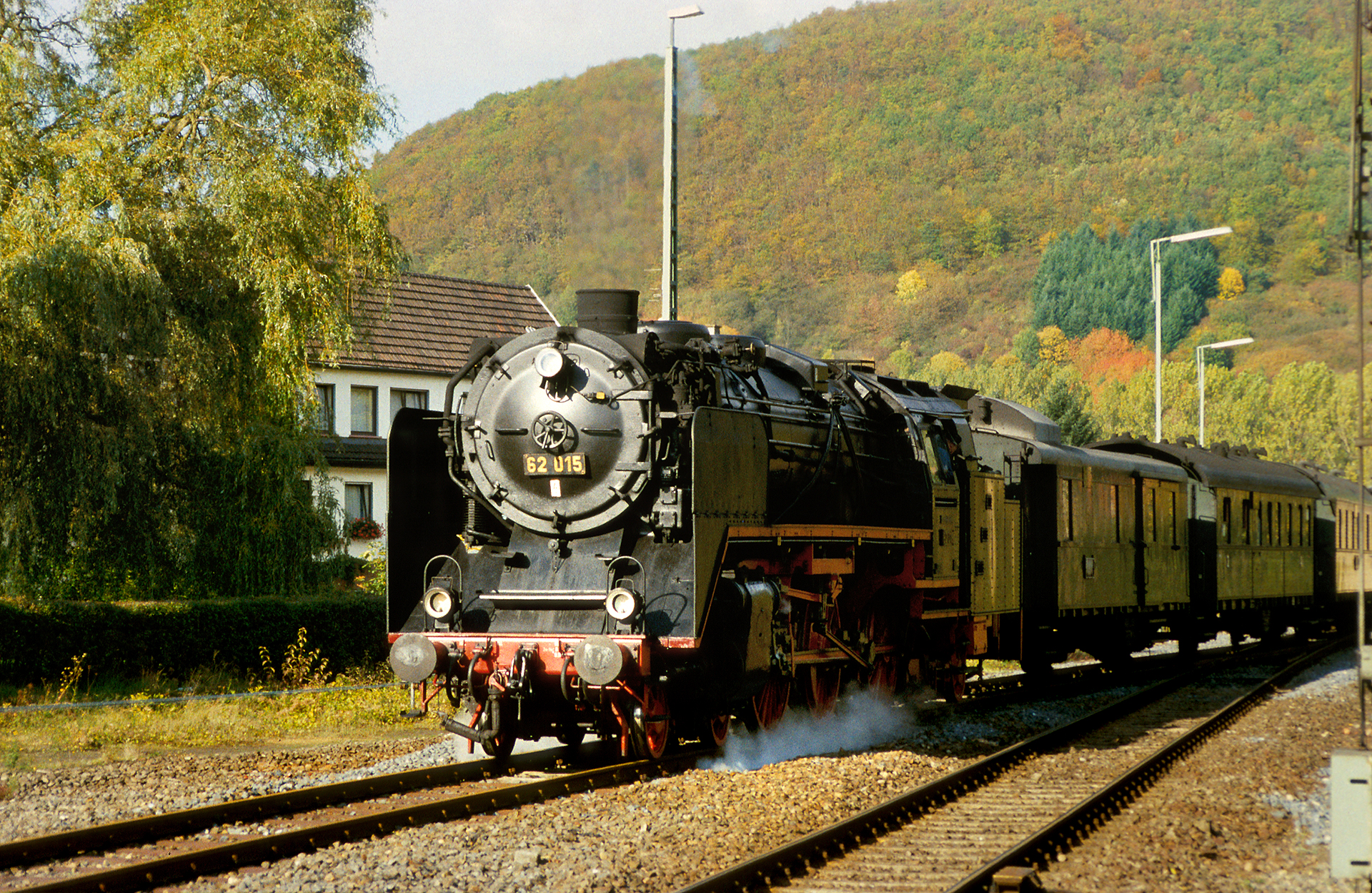 Widmen wir uns wieder besserem Wetter. 62 015 setzt wieder um, aber diesmal anders als zuvor gesehen. Der Zug steht auf Gleis drei und 62 015 fährt über Gleis 1 wieder hinter den Zug, der dann wieder auf Gleis 1 gedrückt wird. Durch die viele Umsetzer- und Rangiererei sind etliche dieser Aufnahmen entstanden, die sich ideal als Poster oder für eine Lokpräsentation eignen würden. Die reizvolle Lage der Ahrtalbahn tut sicherlich ihr Übriges.