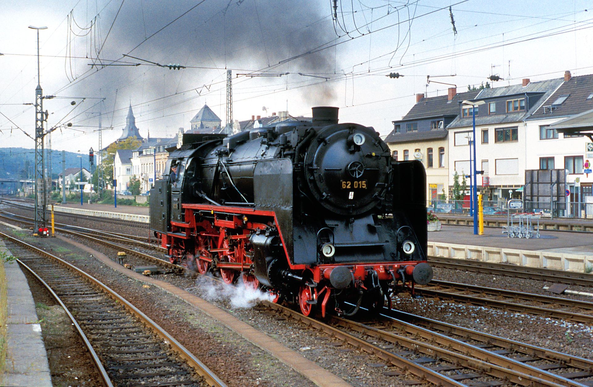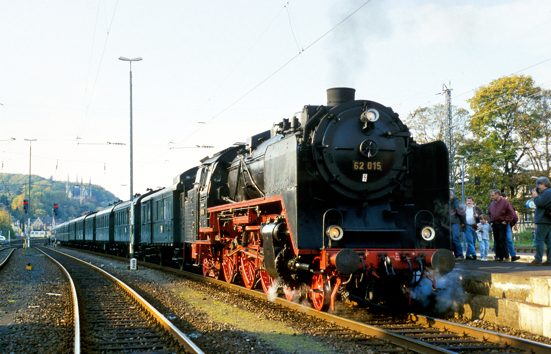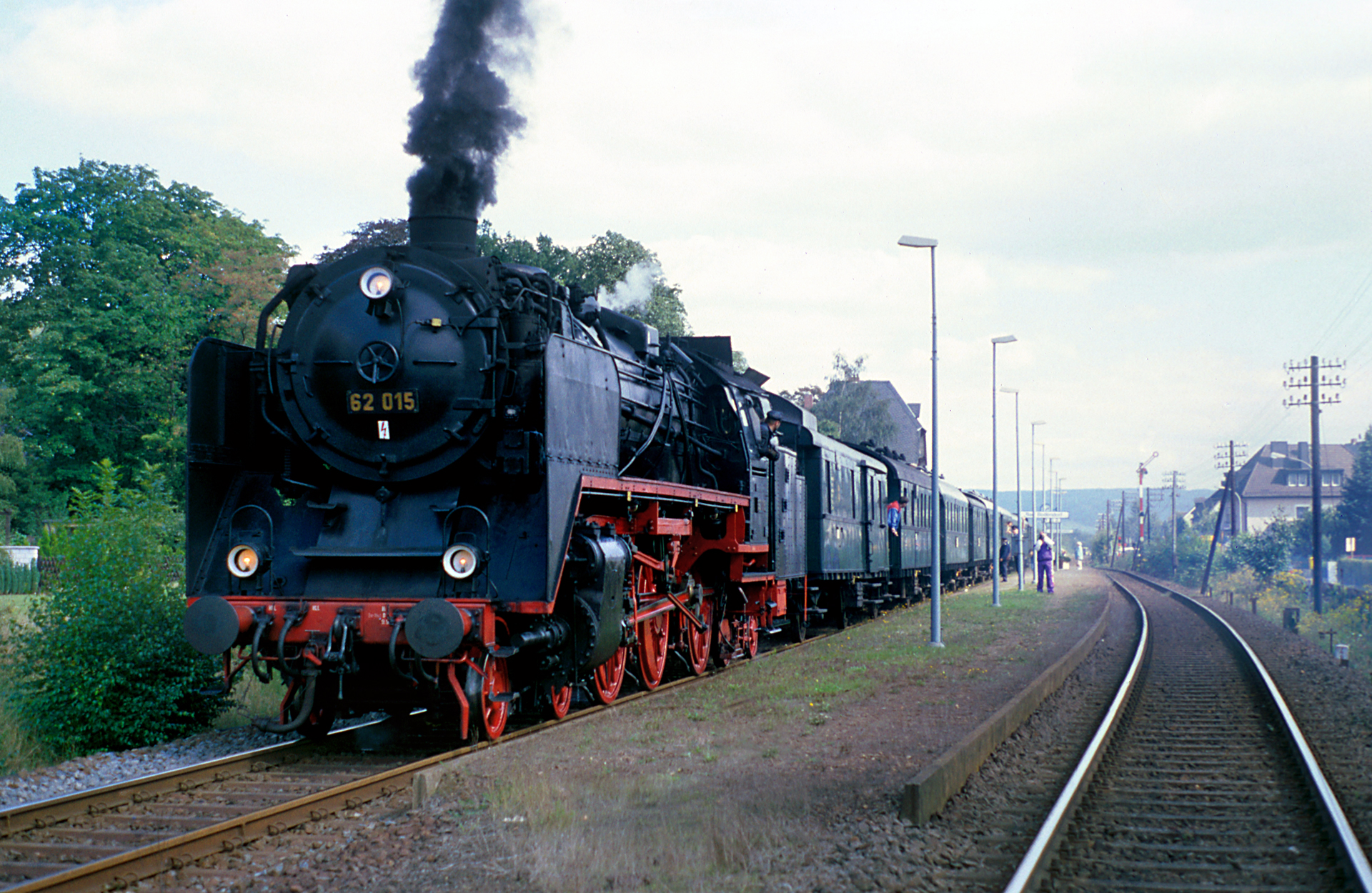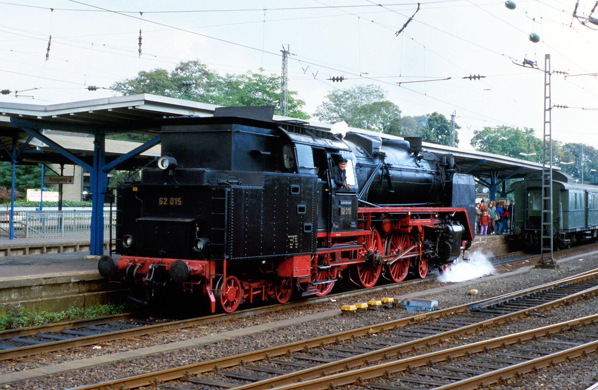 Wir sehen 62 015 vorgerückt bis zum Anfang des Bahnsteigs unmittelbar vor der Abfahrt. Ob mein Vater trotz gezogenem Ausfahrtsignal im Gleis steht, oder ob es sich hier nur um einen fotografischen Effekt handelt, wer mag das noch rekonstruieren können? Der Bildkomposition tut der Standort jedenfalls keinen Abbruch, im Gegenteil. Und die mitten im Bild befindliche Fototasche habe ich kurzerhand weggestempelt – elektronische Bildbearbeitung sei Dank!