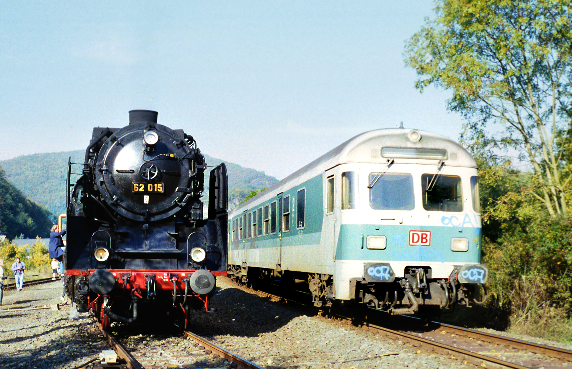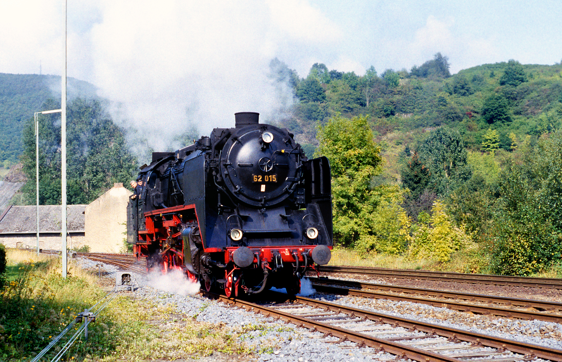 Gut, ein allerletztes Bild – schon des Karmas wegen! Der Regionalzug nach Ahrbrück zieht gerade an 62 015 vorbei, die auf dem Foto fast schon aussieht als wäre sie kaltgestellt. Das Lokpersonal begibt sich , da die Strecke nun wieder frei ist, zurück auf die Maschine. Die oben in Ansätzen gezeigten Umsetzmanöver stehen an.