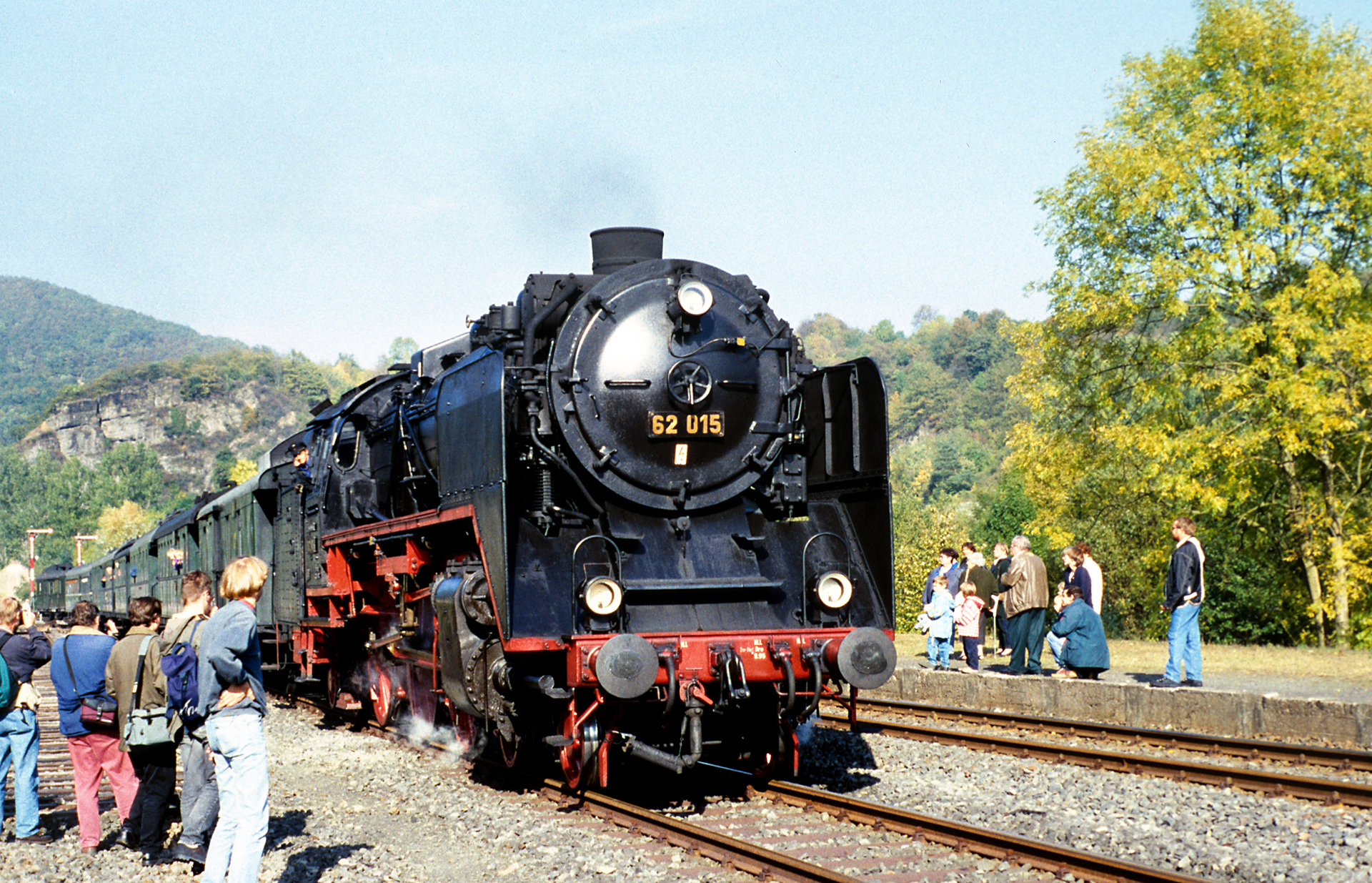Wir sehen dass 62 015 Tender voran den Rückweg aus Kreuzberg (Ahr) beschreitet. Vom ehemaligen Bw Kreuzberg und seiner Drehscheibe ist längst nichts mehr übrig geblieben. Doch macht 62 015 auch von hinten eine überaus gute Figur, wenngleich das viele Schwarz so manche Belichtungsmessung durcheinanderbringen mag und ganz und gar nicht in den Schatten möchte. Die nächste Aufnahme zeigt wie der Regel-Nahverkehrszug sowie der Nostalgie-Ahrtal-Express den Bahnhof fast zeitgleich in unterschiedliche Richtung verlassen.