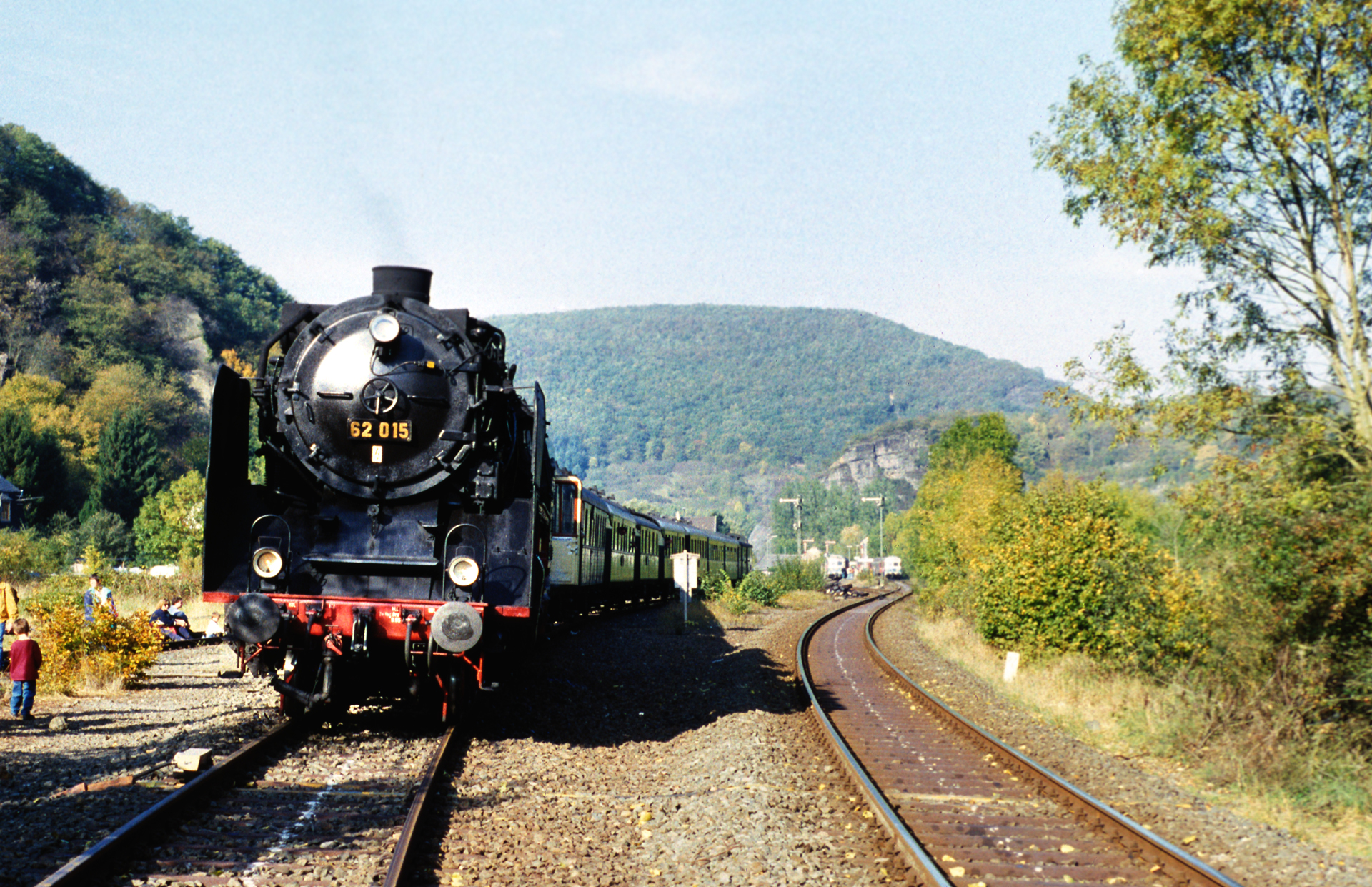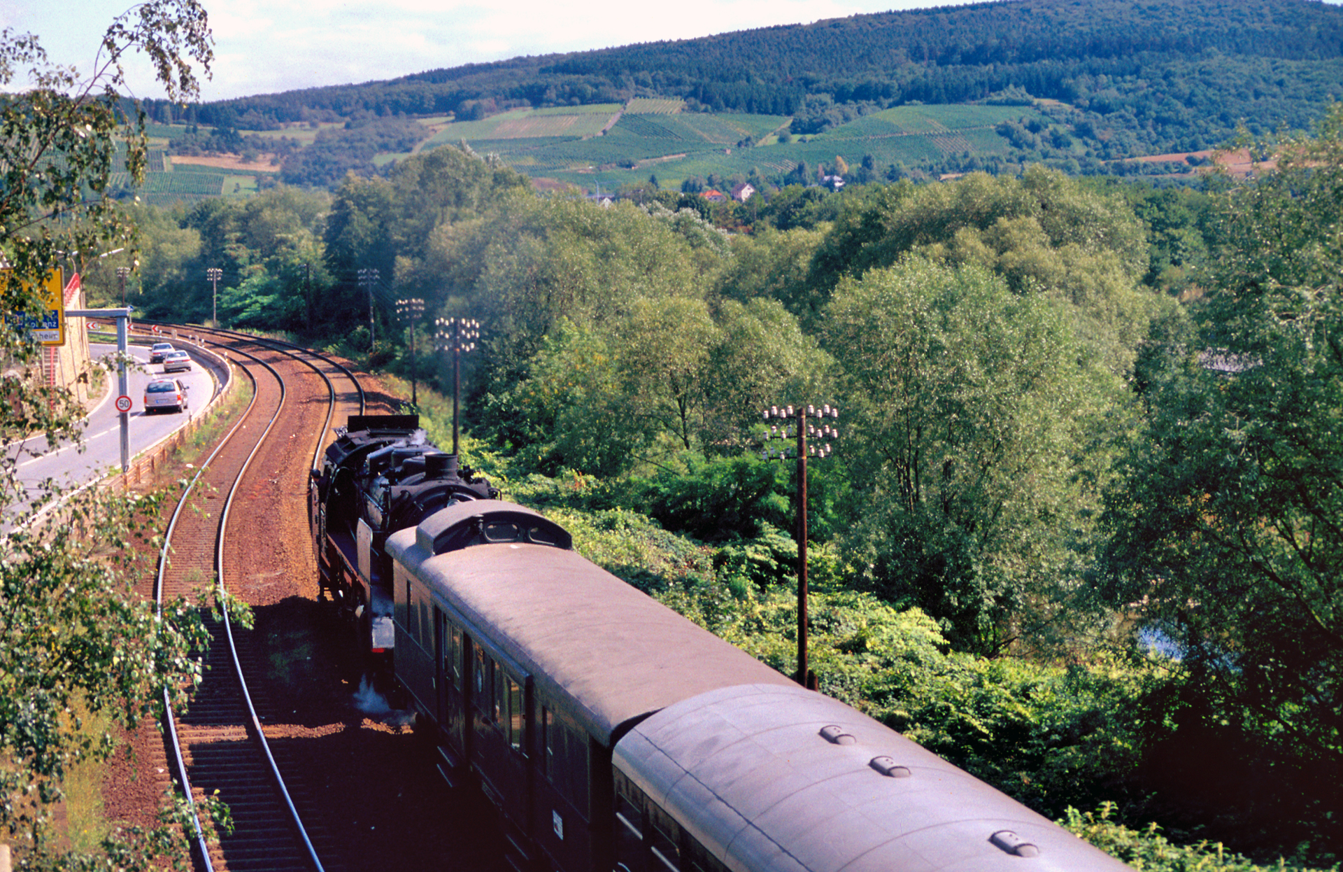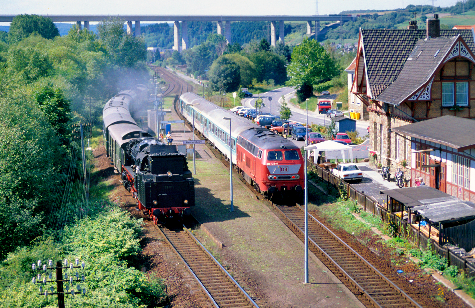 Der herrliche Spätsommertag lässt das Motiv von der Fußgängerbrücke aus fotografiert geradezu modellbahnhaft wirken, der ohnehin satte Farbdiafilm tut sein übriges. Die Fußgängerbrücke übrigens verbindet den Bahnhof mit der Stadt, denn die Ortschaft Heimersheim liegt südlich des Bahnhofs. Zwischen ihr und dem Bahnhof liegt zudem noch die Ahr selbst sowie die vierspurige Bundesstraße 266.
