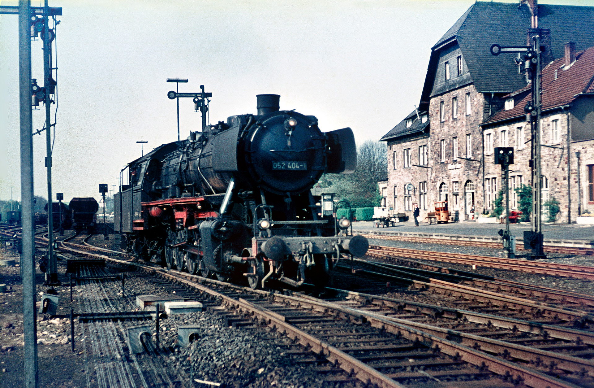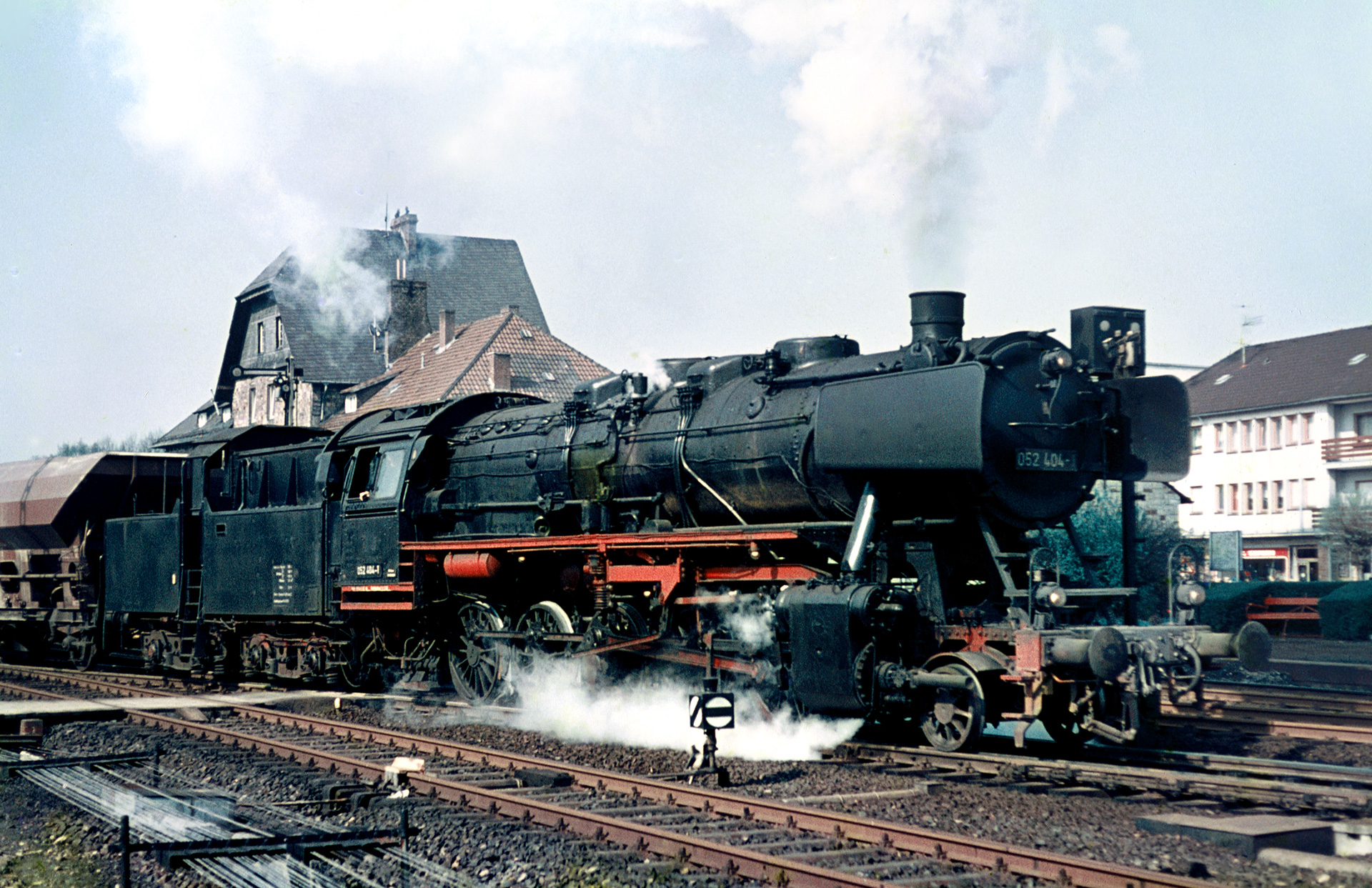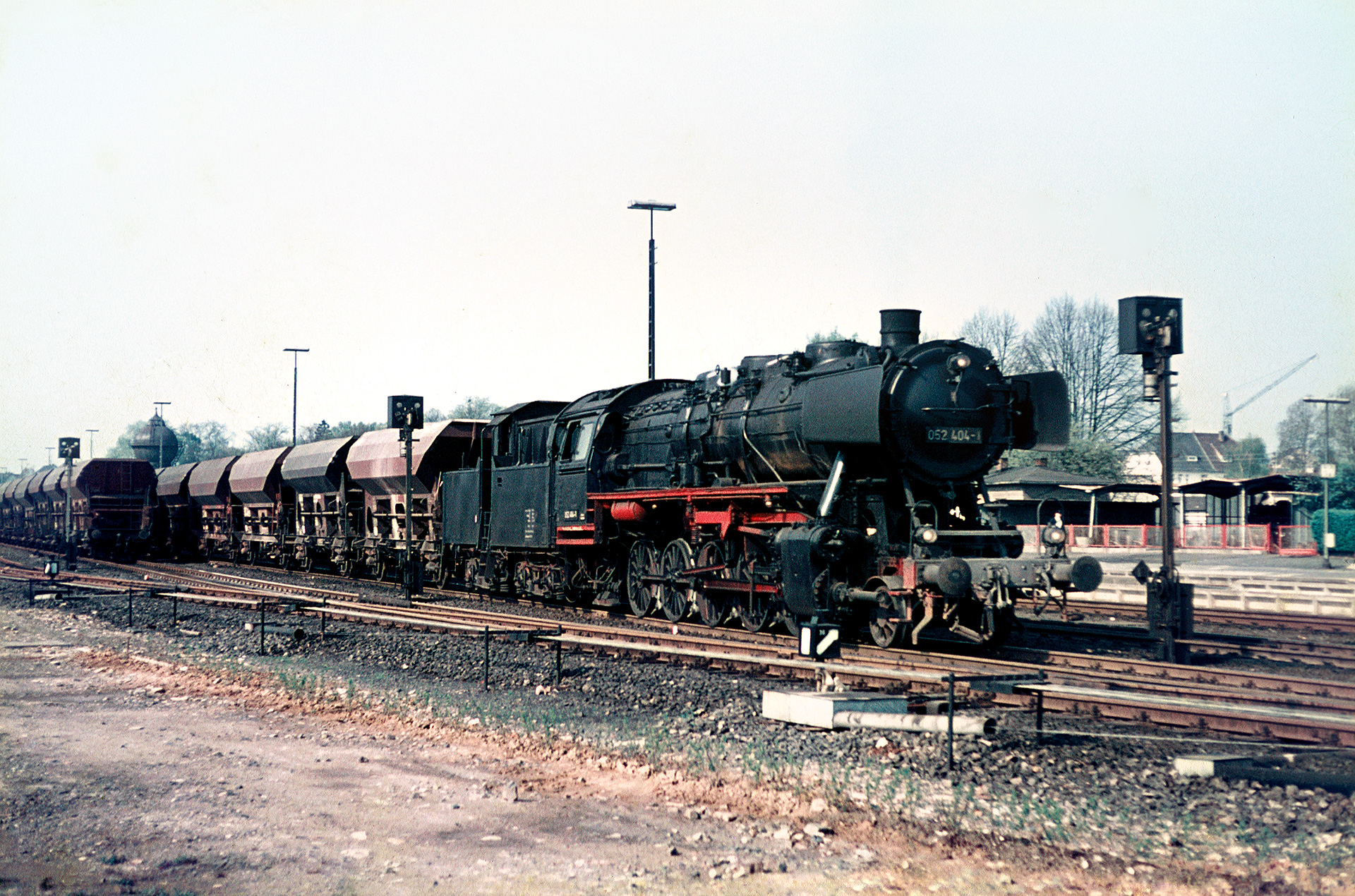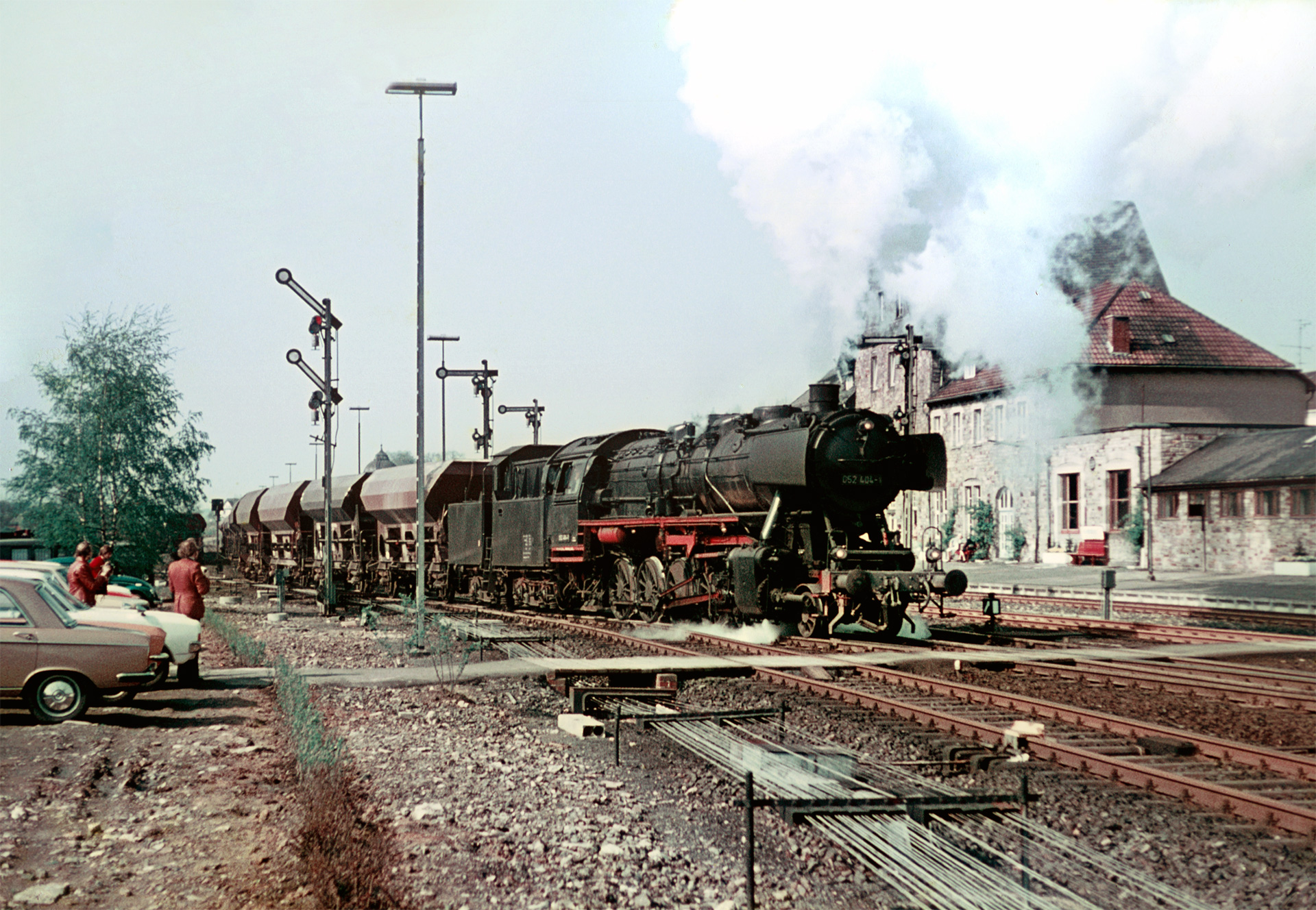Ein Bild war es meinem Vater zudem wert, wie 50 2404 vor dem dort abgestellten Zug mit Schüttgutwaggons, welche mutmaßlich mit Schotter beladen waren, auf Ausfahrt wartet.