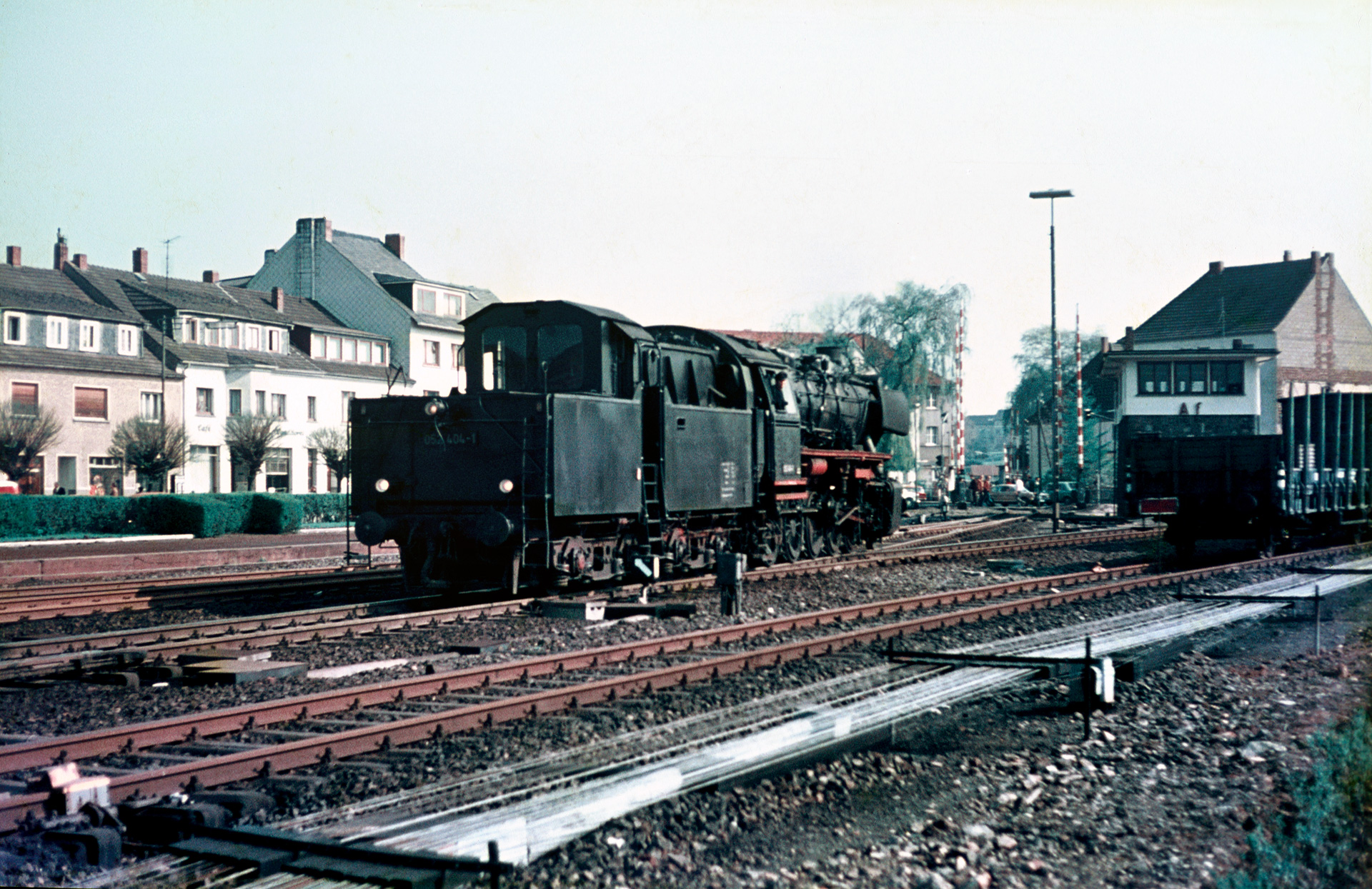 Die Schlagbäume an der Koblenzerstraße sind oben. 052 404-1 begibt sich wieder zurück durch die Weichenstraße zu den Gütergleisen.