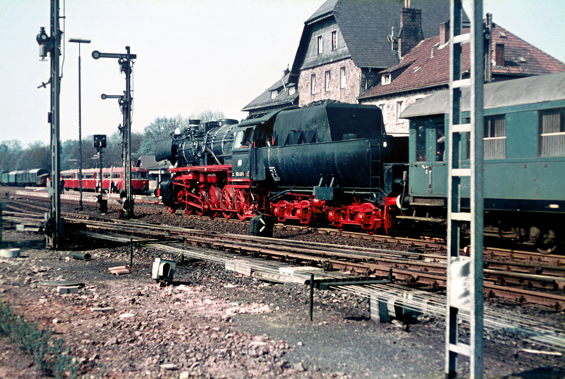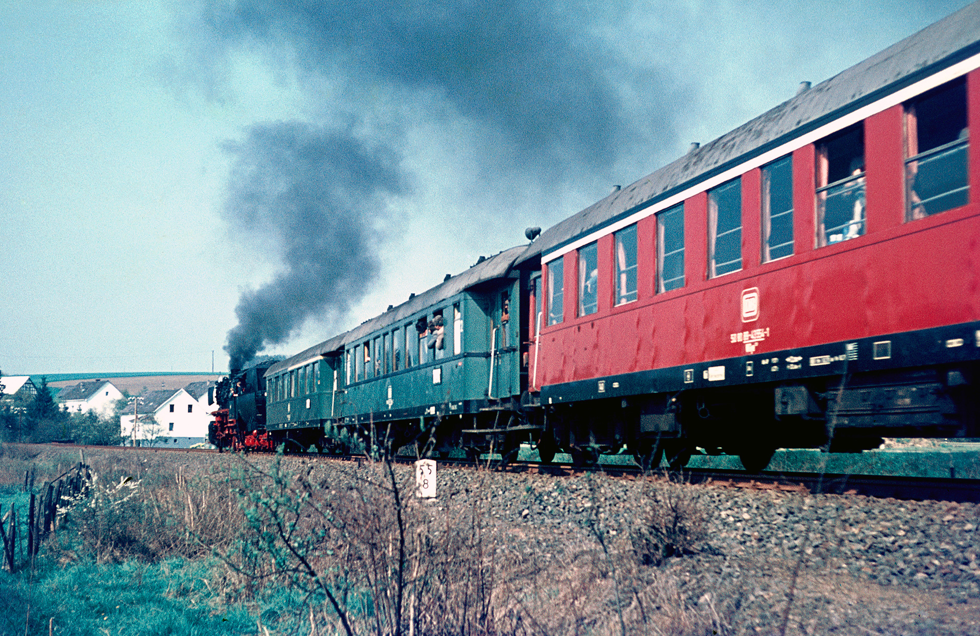 die Fahrt hat mir damals, obwohl ich gar nicht dabei war, zwei Nächte mit wenig Schlaf beschert. Im Bw Gremberg hatte ich mir nämlich in der Woche davor eine Einladung zum Kohleschaufeln eingehandelt, hätte also die gesamte Tour auf dem Führerstand verbringen und gewiss auch Super 8 Aufnahmen machen können. Doch andererseits fuhren meine Eltern über Ostern mit dem Zug nach Juist. Kein Schlaf weil: Vorletzte Chance auf regulären Schnellzugdampf mit 012 oder einmaliges Erlebnis in Westerwald und Eifel? Die Entscheidung fiel dann zugunsten der 012, denn die 052 428 konnte ich ja noch jederzeit mit dem Fahrrad besuchen. Dachte ich, aber die kam bals nach Mayen. Deshalb bin ich auch froh, nun weinigstens Fotos von dieser Tour zu sehen.