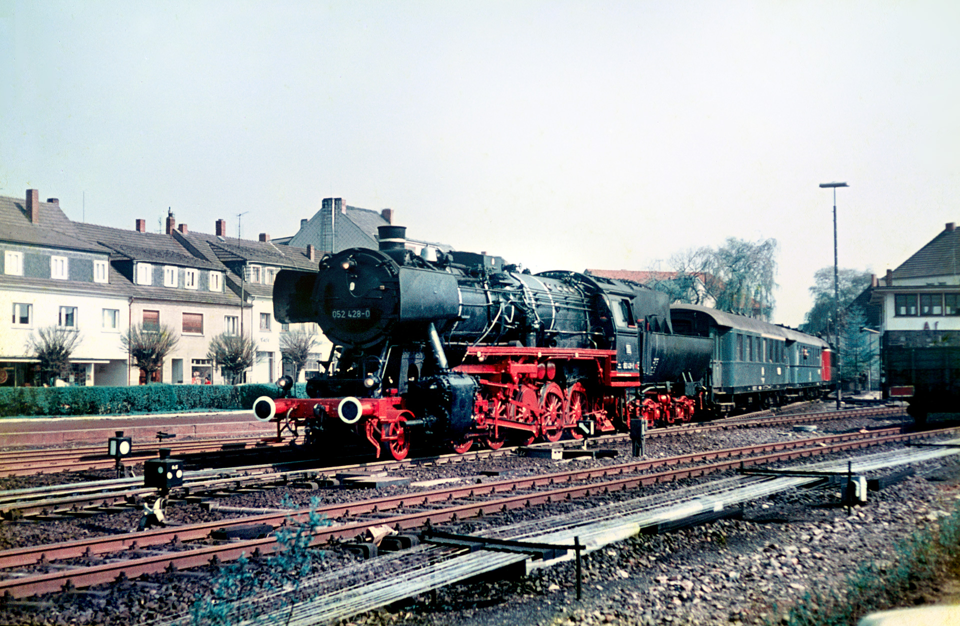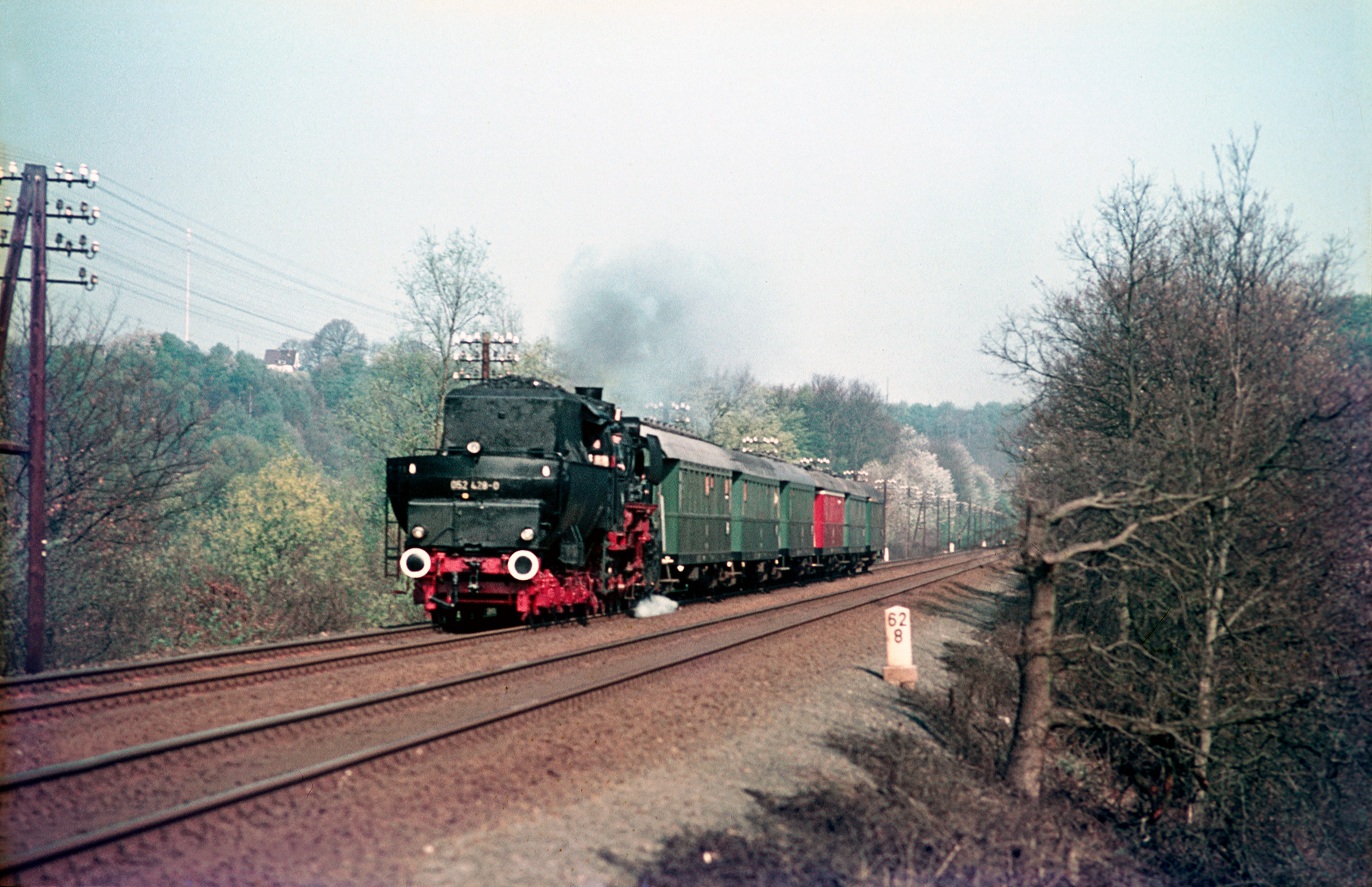 Wie das Eingangsbild verrät, wurde das erste Bild der Lok an km 62.8 noch vor Au (Sieg) geschossen. Die 052 428-0 kommt Tender voran Richtung Au. Die Lok zeigte sich bei der Fahrt bis aufs Detail herausgeputzt. Silberfarbene Kesselringe, einen Ring um den Schornstein, ein sehr sauberes, frisch lackiertes Fahrwerk und sogar noch gänzlich unberührt anmutende Pufferteller, die so grell im Licht glänzten, dass man Probleme hatte sie anständig aufs Dia zu bekommen, waren alles andere als gewöhnlich für diese Zeit. Gerade im Ruhrgebiet hat man das Gefühl, die dort noch abgestellten Dampfrösser rosten im Einsatz aktiv ihrer Ausmusterung entgegen. Schon deshalb wird die Sonderfahrt wohl angenehme Erinnerungen erzeugt haben.