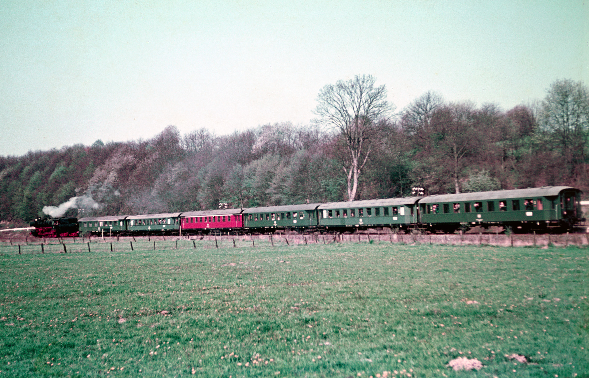 Man sollte bedenken: 1974, zur Zeit als diese Bilder entstanden, war das BW Remscheid-Lennep an der Heimstrecke schon etliche Jahre Geschichte (und existierte in H0 lediglich noch im heimischen Keller). Den normalen Zugverkehr hat längst die V100 mit ihren Silberlingen übernommen. Es war also bereits durchaus eine gelungene Abwechslung, auf eine Dampflok zu treffen bzw. musste mein Vater zu dem Zeitpunkt dafür bereits einige km zurück legen. Vielleicht auch deshalb war die Ausfahrt meinem Vater ein weiteres Bild wert.
