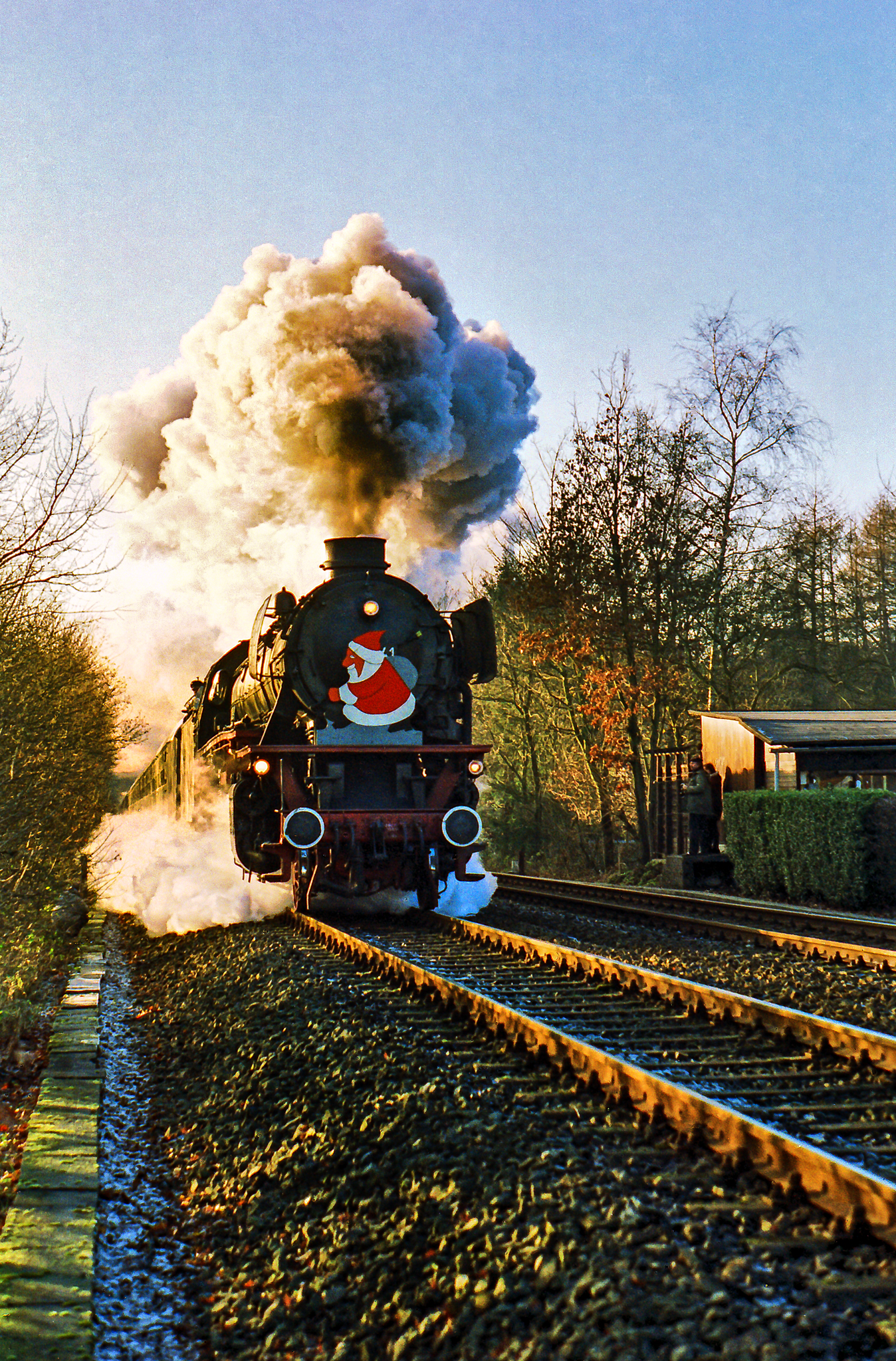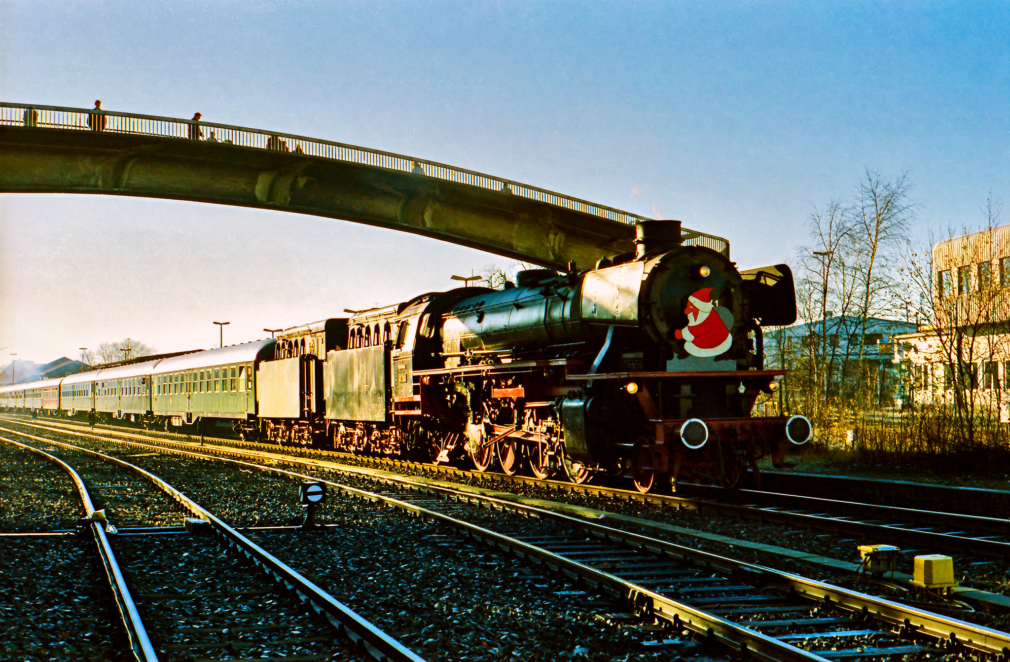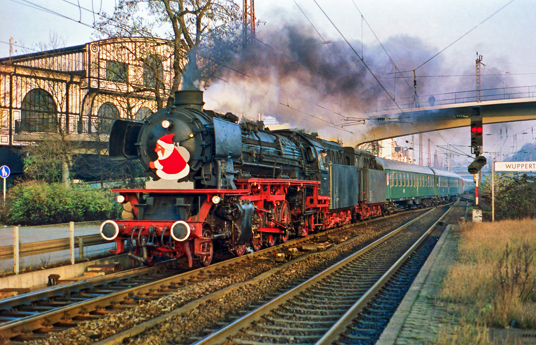 Begonnen haben die Nikolauszüge mit den 41ern in den späten 80er oder frühen 90er Jahren, so ganz genau lässt sich das (von mir) nicht mehr bestimmen. Nach Aufhebung des Dampflokverbots war 41 360 ab Mai 1987 ohnehin ständig hier in der Region und auch ganz konkret auf der Strecke Solingen-Remscheid-Wuppertal unterwegs. Die Nikolausfahrten vor Weihnachten wurden dann zügig zu einer Tradition, die sich die ganzen 90er Jahre durchzog und auch in meinem Kalender stets mit einem roten Ausrufezeichen versehen war.