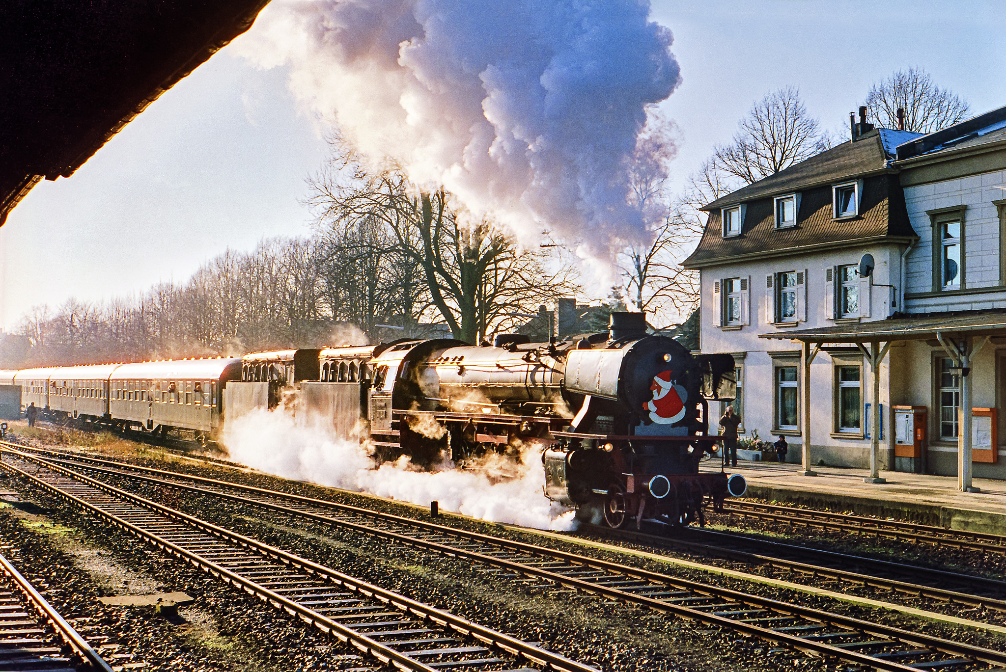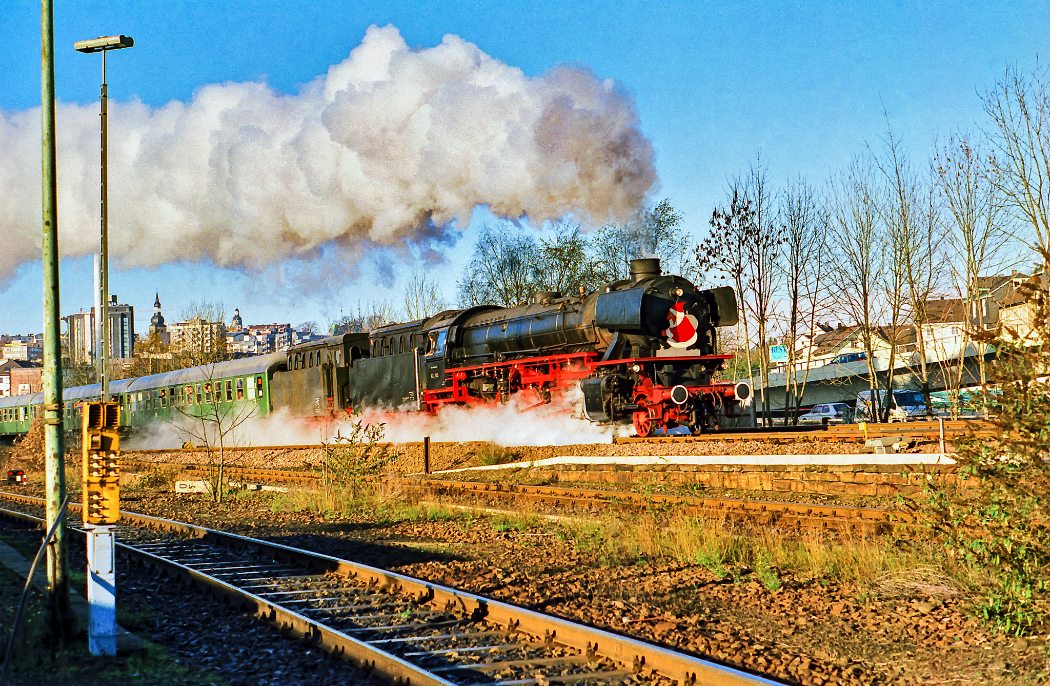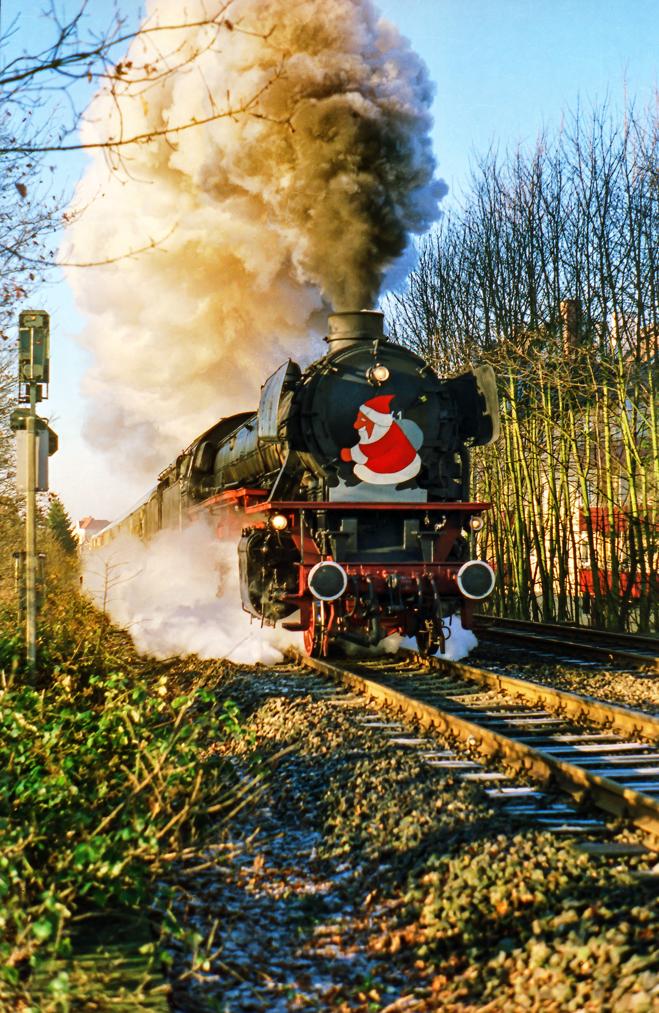 Begonnen haben die Nikolauszüge mit den 41ern in den späten 80er oder frühen 90er Jahren, so ganz genau lässt sich das (von mir) nicht mehr bestimmen. Nach Aufhebung des Dampflokverbots war 41 360 ab Mai 1987 ohnehin ständig hier in der Region und auch ganz konkret auf der Strecke Solingen-Remscheid-Wuppertal unterwegs. Die Nikolausfahrten vor Weihnachten wurden dann zügig zu einer Tradition, die sich die ganzen 90er Jahre durchzog und auch in meinem Kalender stets mit einem roten Ausrufezeichen versehen war.