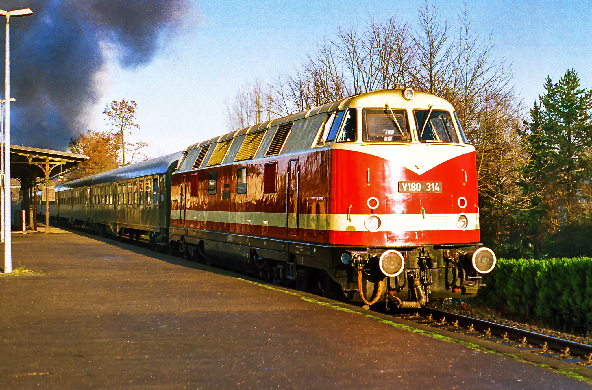 Bis einschließlich 1995 wurde ohne Schublok gefahren. Lediglich bei der ersten Runde von 41 360 über den Remscheider Berg 1987 wurde auf eine Schublok bestanden, danach konnte konsequent ohne gefahren werden. Es war die Sonderfahrt von 64 491, die vor Güldenwerth auf freier Strecke hängen blieb, der man zu verdanken hatte dass die Nikolausfahrten ab 1996 auch wieder eine Schublok hatten. In der Regel kam hierfür die V 200 033 zum Einsatz, aber es gab auch Exoten wie die V180 314, die aus Dieringhausen abberufen wurde. Da lohnt sich auch mal ein Nachschuss.