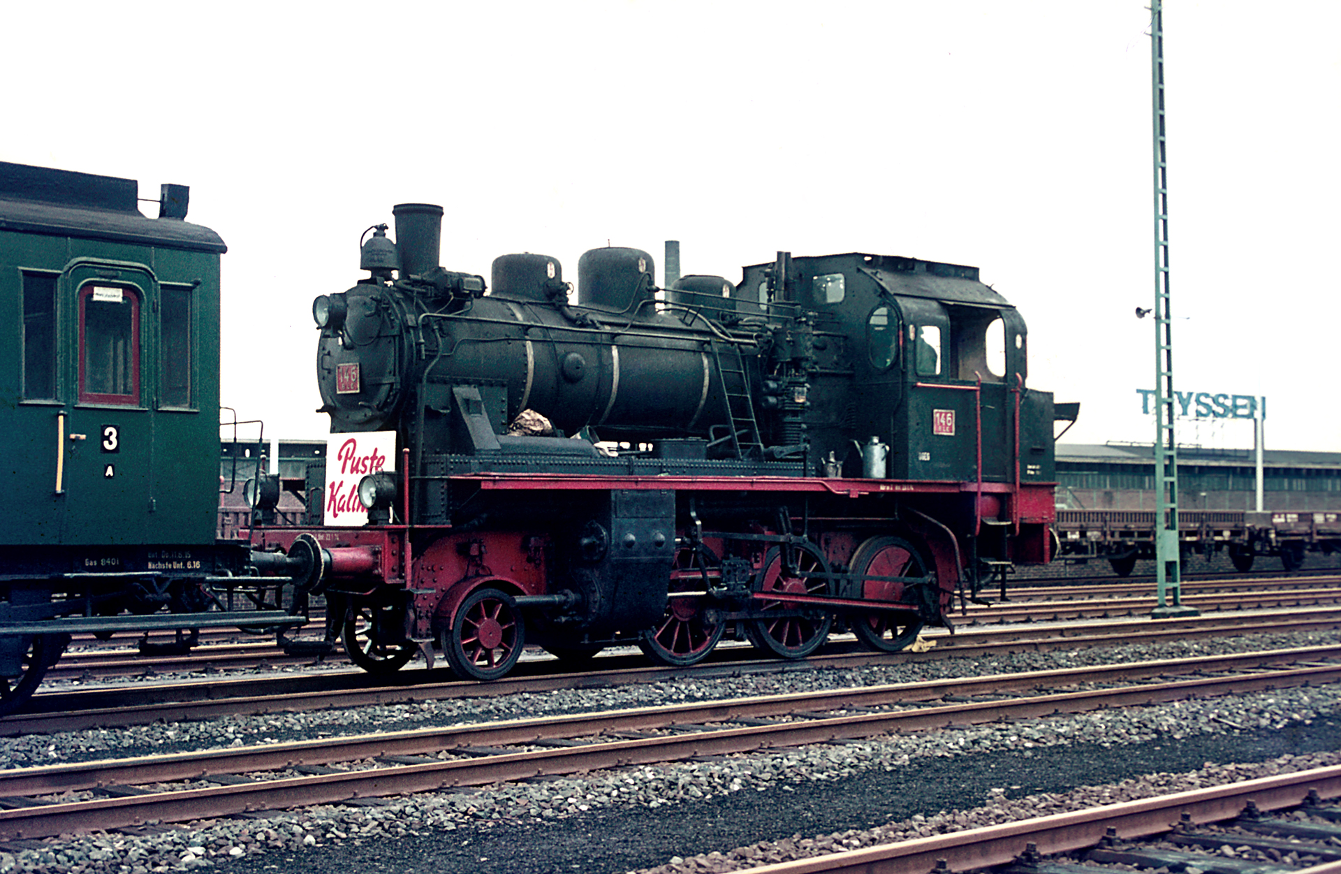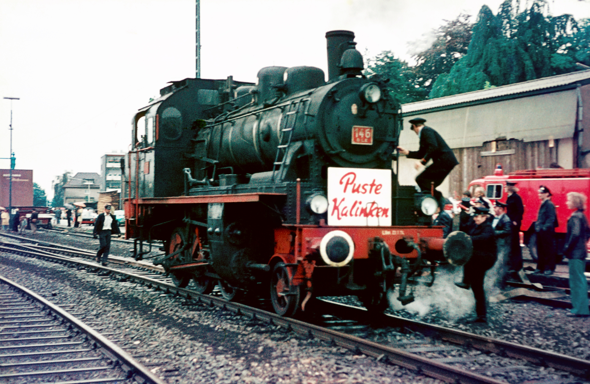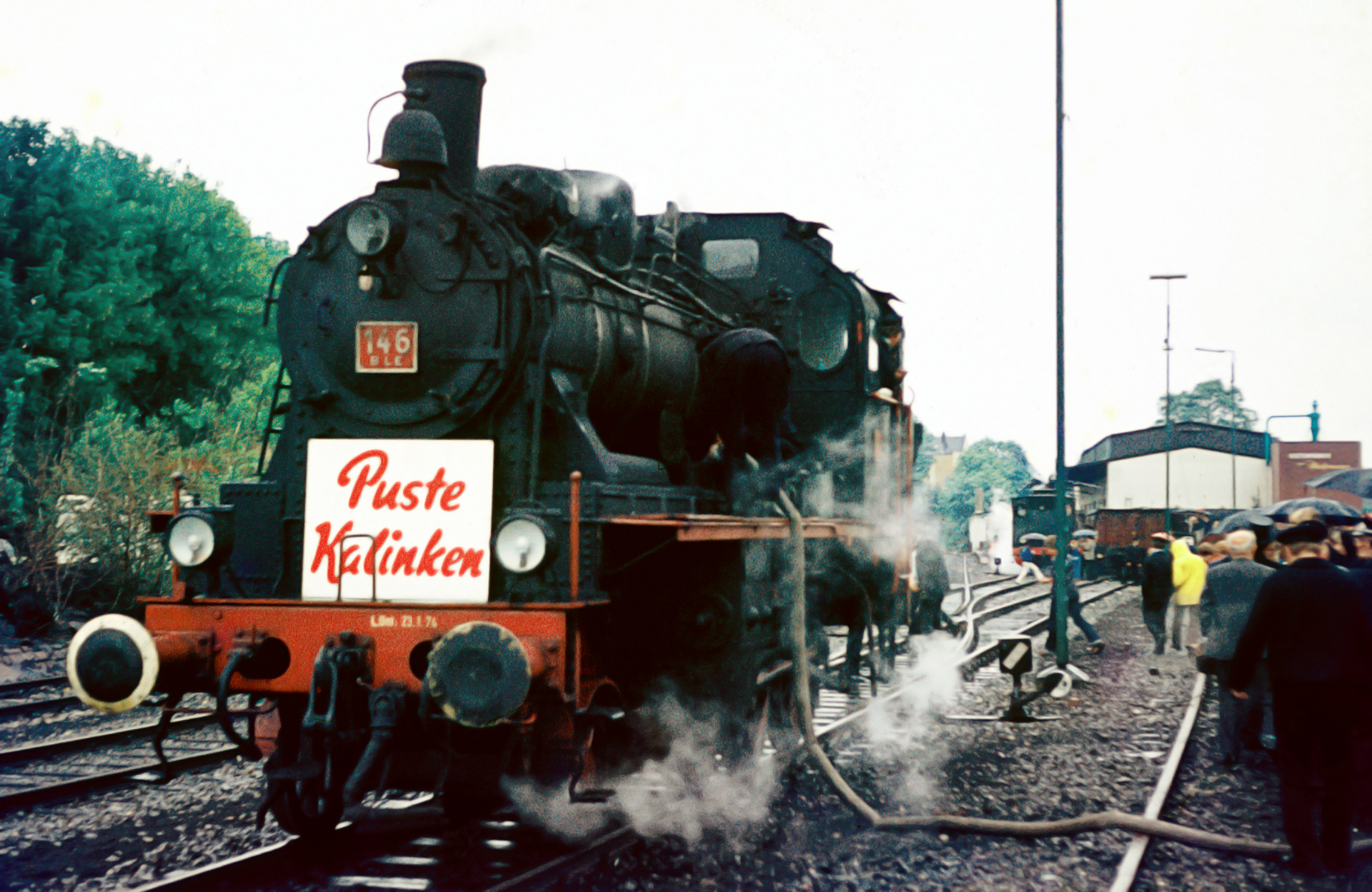 Die Lok BLE 146, auf der zur Zeit der Sonderfahrt an der Rauchkammer das Schild Puste-Kalinken prankte, war bereits 1976 Eigentum des Eisenbahnmuseums Bochum-Dahlhausen und wurde bei zahlreichen anderen Veranstaltungen eingesetzt. Die Lok ist übrigens bis heute erhalten, allerdings derzeit nicht betriebsfähig. Über Wuppertal fuhr sie hoch nach Remscheid Hbf und wurde dort im Pendelverkehr nach Remscheid-Hasten eingesetzt. Nicht zum ersten Mal und auch nicht zum letzten Mal organisierte der umtriebige Verkehrsverein Hasten eine Sonderfahrt „zur Filiale“. Mit Puste-Kalinken und den Sonderfahrten am Wochenende des 19. und 20. Juni 1976 fuhr aber zum letzen Mal eine Dampflok auf der gut 5km langen und nach Hasten stark abfallenden Stichstrecke.