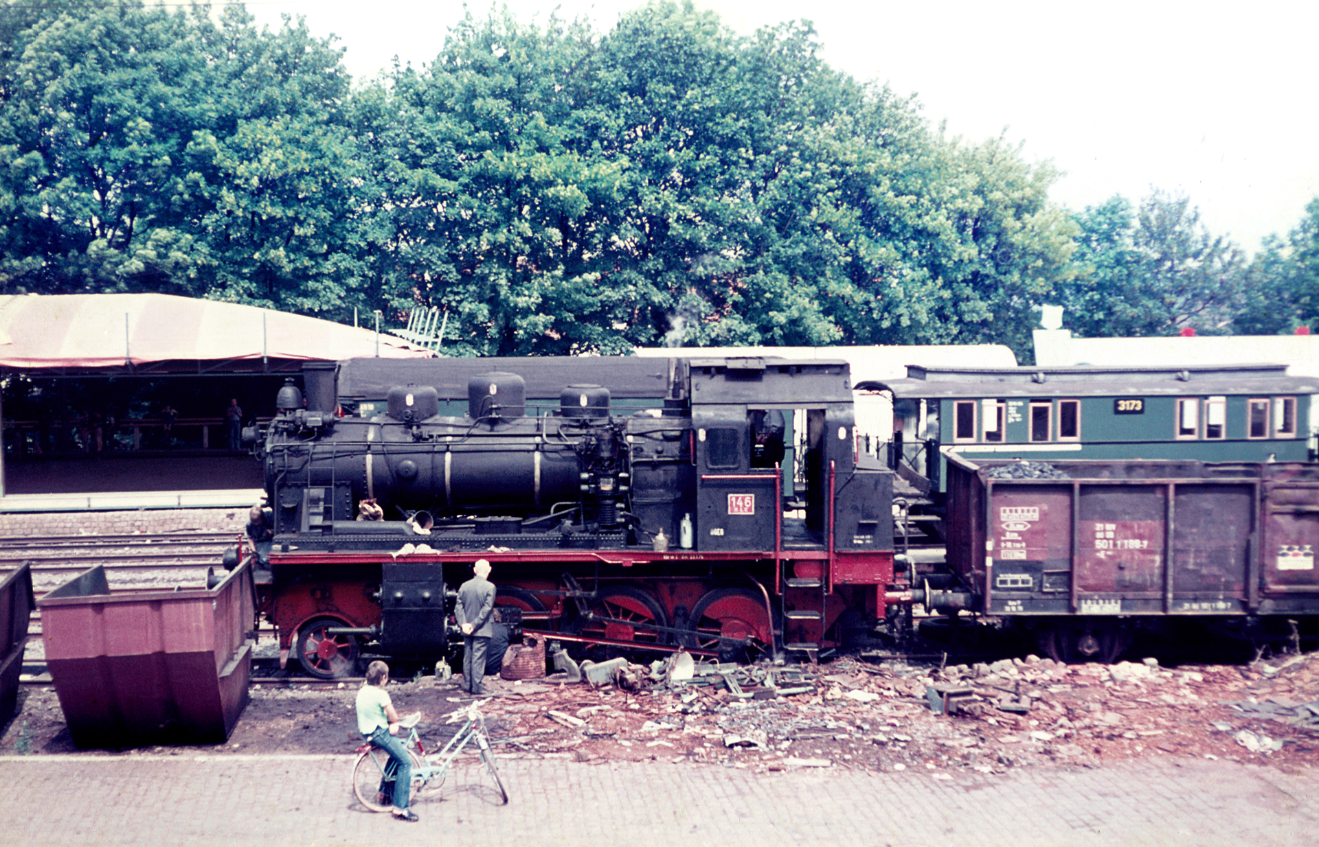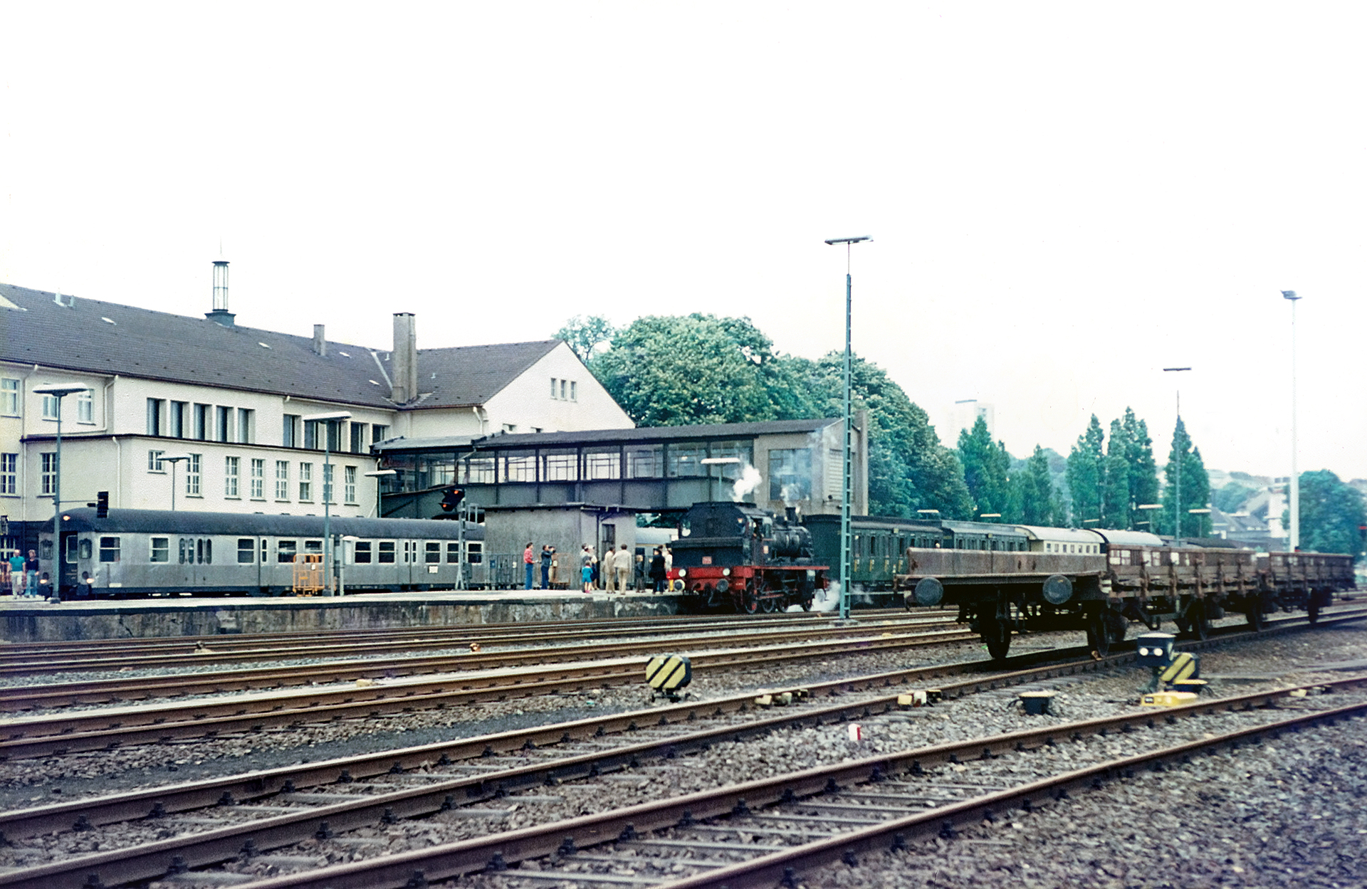 Das Ende der Dampflokzeit war bereits lange besiegelt. Lediglich für den Güterverkehr waren auf einigen Strecken noch im Regelbetrieb Dampfloks unterwegs. In den 70ern verkehrte in Remscheid bereits längst die V100 mit ihren Silberlingen im Regelverkehr, Triebwagen sowie ebenfalls die V100 mit ihren Umbauwagen übernahmen den sich ausdünnenden Verkehr auf der Nebenbahn. Bereits ziemlich genau ein Jahr nachdem Puste-Kalinken nach Remscheid-Hasten fuhr, sollte der Dampfbetrieb auf deutschen Gleisen über etliche Jahre sogar komplett verboten werden, weshalb diese Sonderfahrt natürlich nicht nur von alten Zeiten erzählen durfte, sondern auch für ein wenig Wehmut bei all denen sorgen dürfte, die nicht Tag für Tag auf den zugigen Maschinen ihre Arbeit verrichten mussten, sondern sich an der Dampflok erfreuten wie mein Vater.