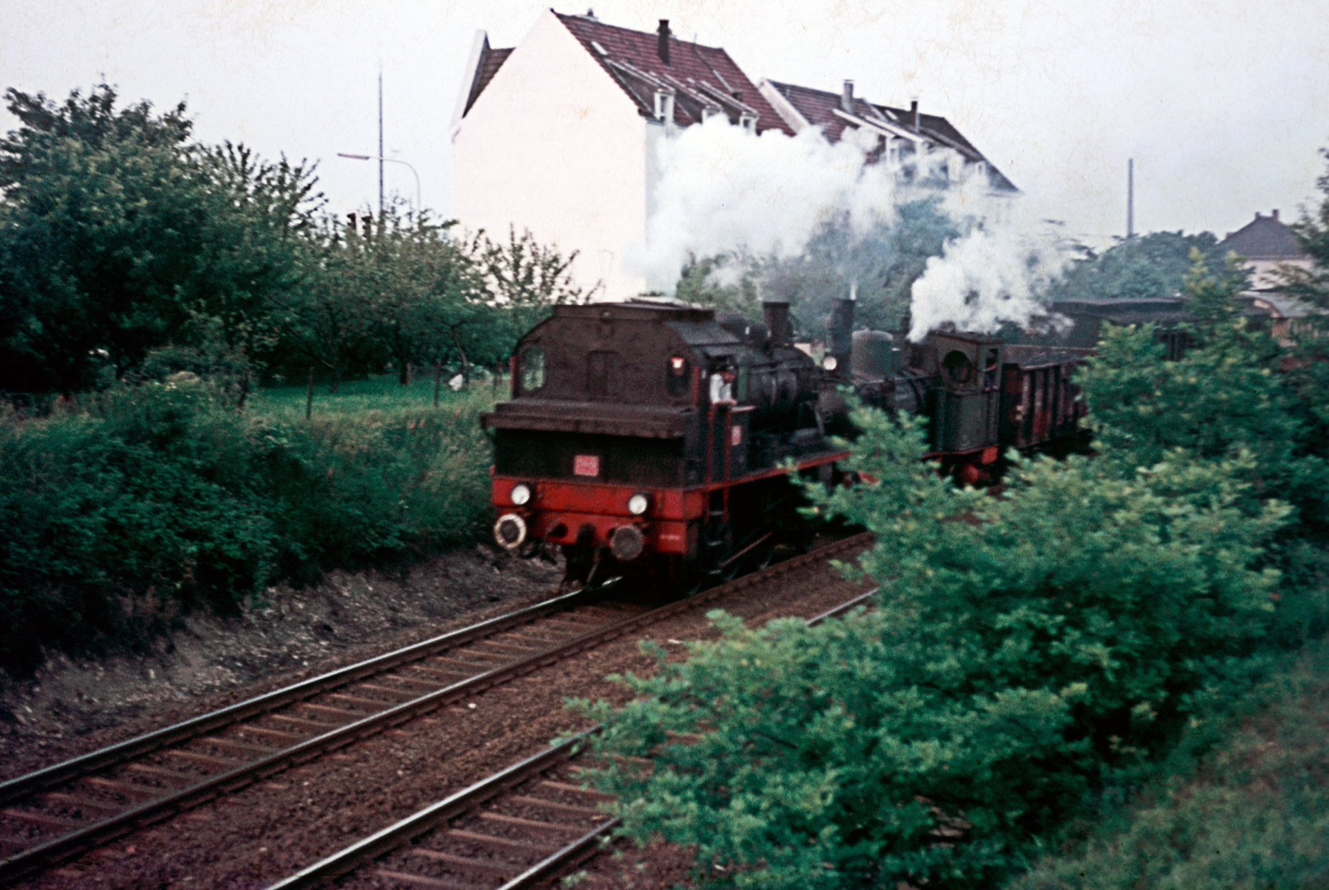 Zuvor gelang meinem Vater gelang eine Aufnahme des Tross‘ mit Vorspann zwischen Remscheid-Lennep und Remscheid Hbf. Der Zug bewegt sich von Remscheid-Lennep nach Hbf. Wie auf der Aufnahme ersichtlich ist, führen die beiden Loks ihre benötigte Kohle in einem den Personenwagen vorgespannten Güterwaggon direkt mit. Dieser wurde in Hasten abgestellt. Für die nicht ganz ortskundigen Betrachter: Im Hintergrund des Zuges sehen wir zwei große Wohnhäuser. Auf diese Wohnhäuser fährt man zu, wenn man die Autobahn an der Ausfahrt Remscheid verlässt. Der Fotostandort markiert die Mitte zwischen Lennep und Hbf. Da sich dieser Bereich unmittelbar am Wohnort befand, sind hier unzählige Aufnahmen entstanden. Alleine die „mal eben den Film vollmachen Fotos“ dürften Bände füllen können. Das Wetter und die Alterung ließen nicht viel übrig vom Motiv, aus dokumentarischen Zwecken sei es dennoch aufgeführt.