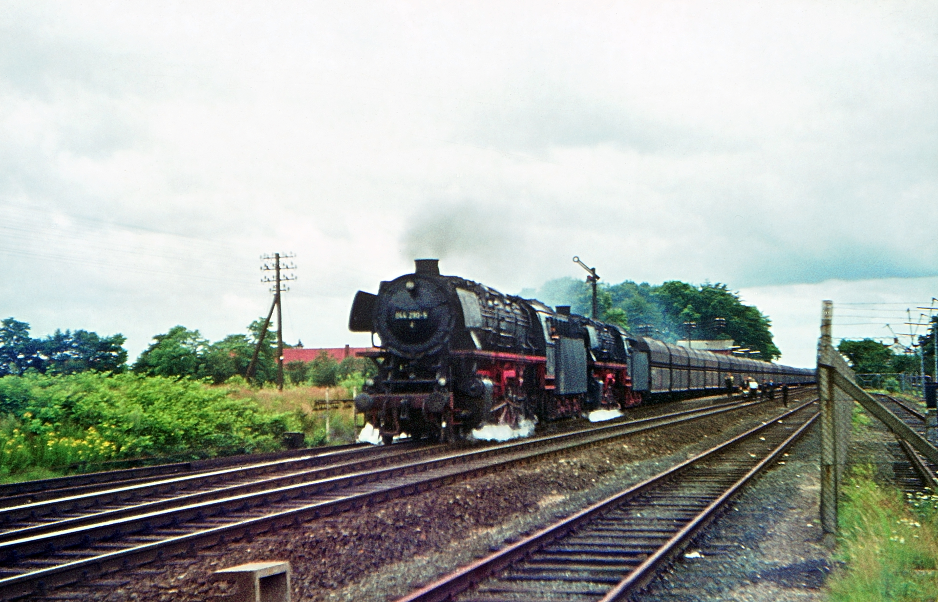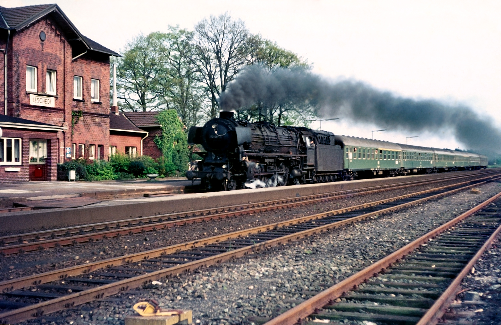 Da wären viele Aufnahmen auch und vor allem aus Leschede zu erwähnen. Schaut man sich diese Aufnahmen an liegt der Schluss nahe dass Leschede vor allem deshalb so interessant gewesen sein muss, weil an dem kleinen Bahnhof zum einen die mit 01.10 bespannten Durchgangszüge eben mit Volldampf durchrauschten, während gleichzeitig zum anderen die Güterzüge auf Ausweichgleisen eben jenen Schnellzügen Platz zur Überholung machen mussten. Zwar galt es aus naheliegenden Gründen die schweren Erzzüge möglichst nicht zum Halt zu nötigen, aber die Emslandstrecke hatte ohnehin weit mehr Güterzüge zu bieten als nur den Langen Heinrich. Dadurch fanden in Leschede gleichermaßen viele Anfahrten von nicht selten schweren Güterzügen statt, wie auch durchrauschende 44er unter Volllast und natürlich die 01.10er von und nach Emden und Norddeich. Eine Win-Win Situation sozusagen für den Eisenbahnfreund.