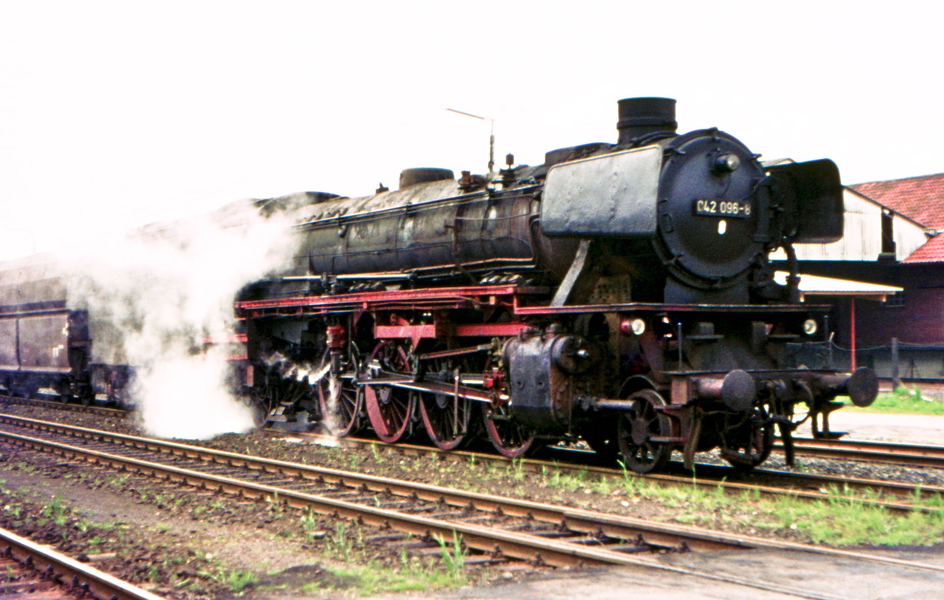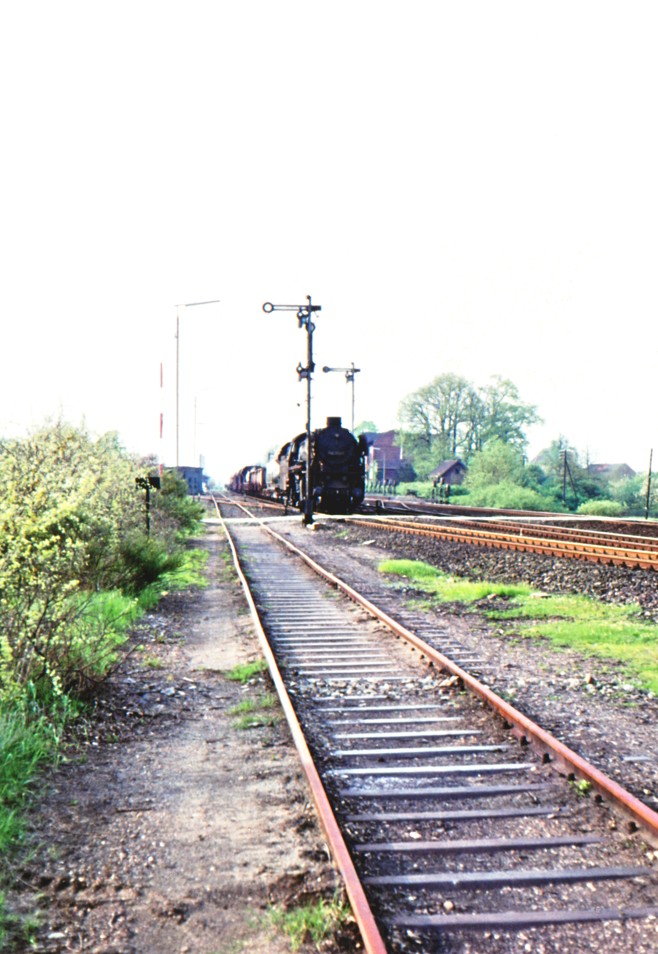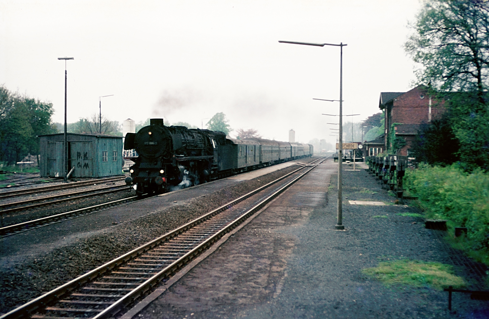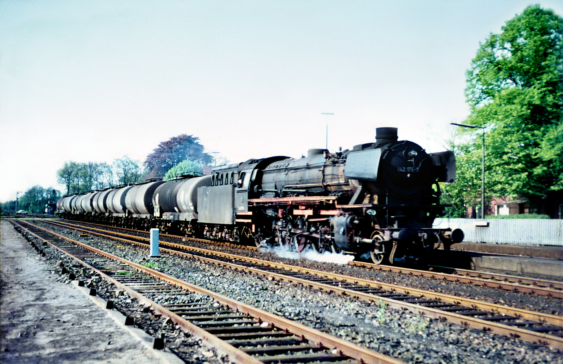 So begegnete meinem Vater 41 175, eine Jung Lok die 1958 auf Ölhauptfeuerung umgebaut wurde und dadurch das Gnadenbrot im Bw Rheine immerhin noch bis Ende September 1976 erhalten durfte. Oder musste sie es sich verdienen? Jedenfalls zieht sie hier einen im Vergleich zur sonstigen Transportleistung kleinen Güterzug bestehend aus Kesselwagen über die Trasse.