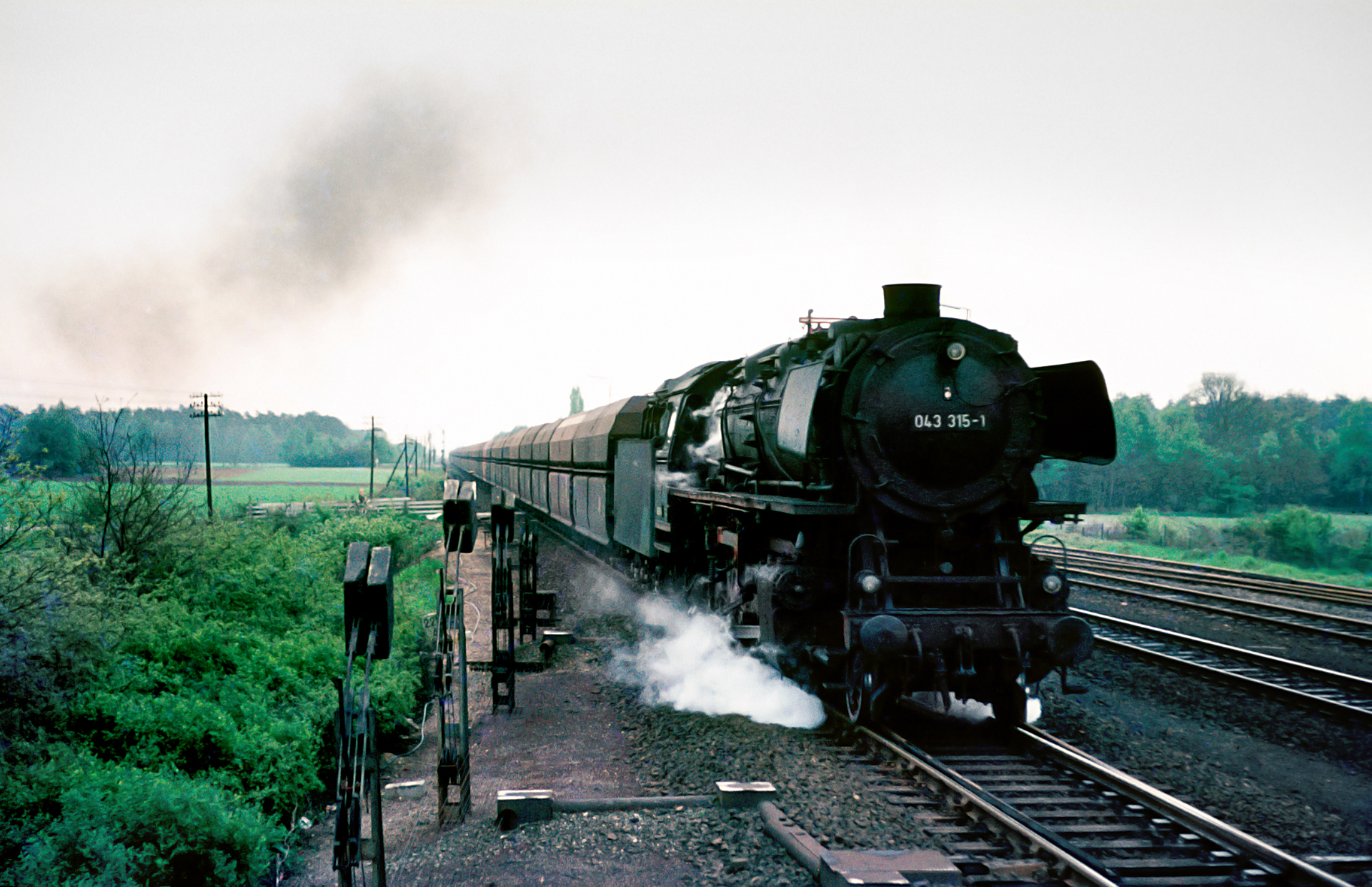 Den Anfang der Serie im Bereich Leschede macht die zu diesem Zeitpunkt in Emden stationierte 043 315-1, die bis zu ihrer letzten Dienststelle schon ganz schön rumgekommen ist. Immerhin 16 Beheimatungen von Minden bis Nürnberg und hoch nach Emden kann sich die 1942 von Krupp in Essen gebaute Lok ins Betriebsbuch schreiben. Bis zum Ende der Dampflok in Deutschland, also bis Ende Oktober 1977 wurde auf ihr noch Plandienst geschoben. Die Lok existiert noch heute und ist von der Stadt Kornwestheim, wo sie ehemals als Denkmal am Bahnhof aufgestellt war, als Leihgabe an das Märklin Museum gewandert.