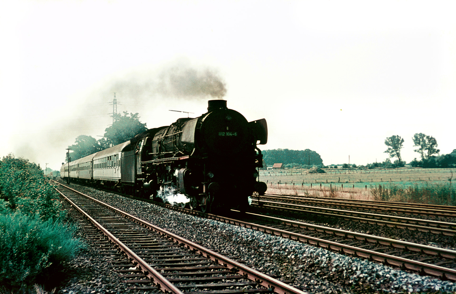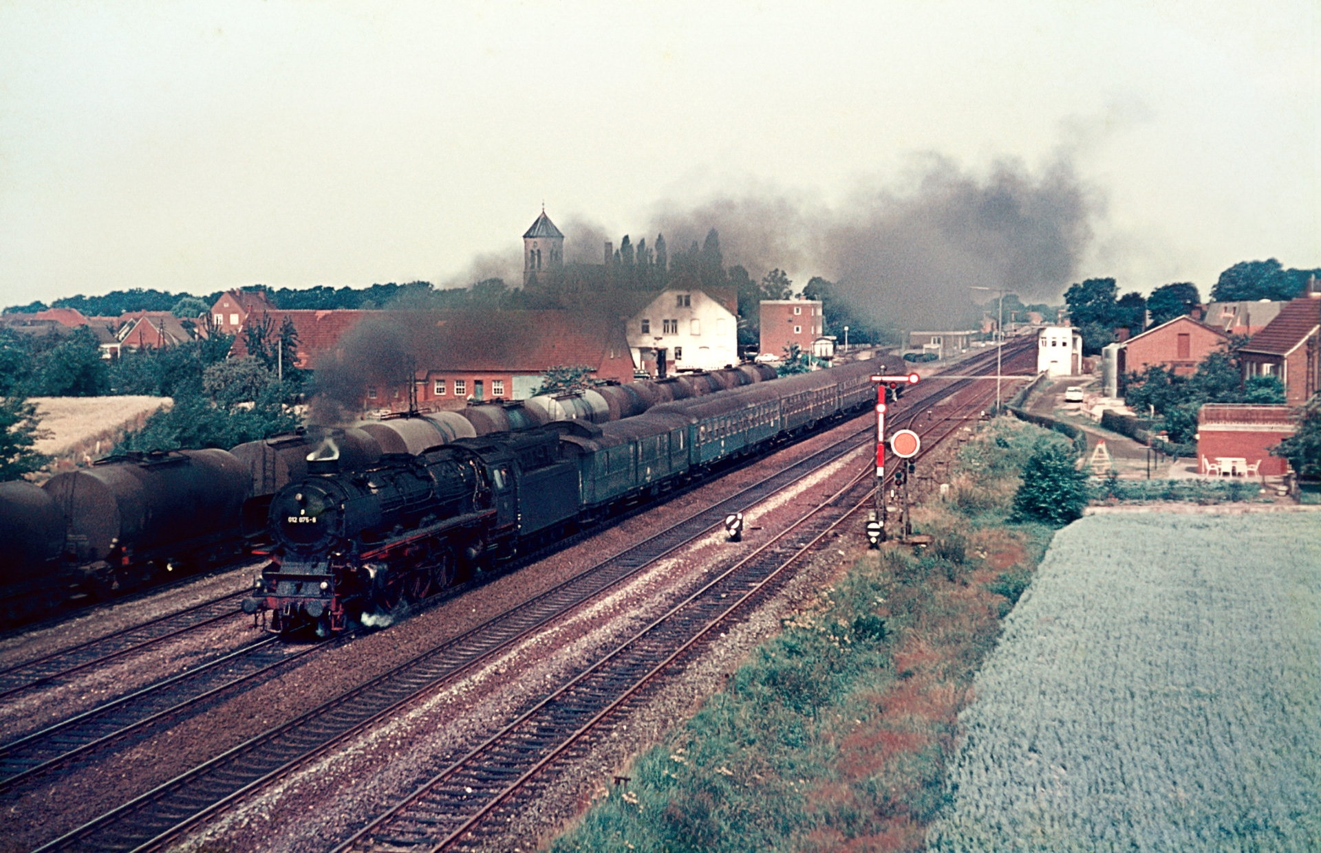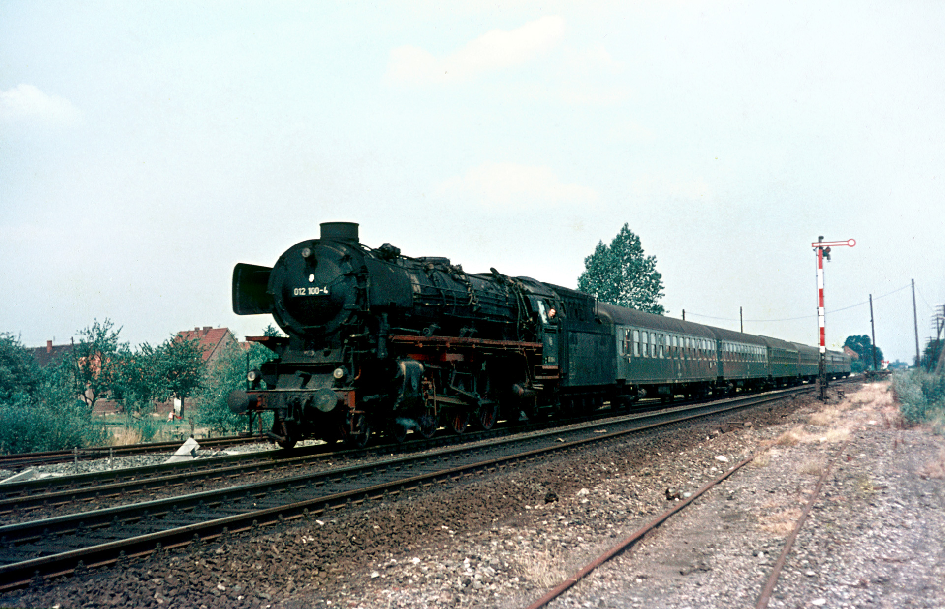 Kommen wir damit direkt zu einer weiteren, heutigen Museumslok, sowie dem Nachweis, dass es nicht nur die Güterzüge waren, die auf der Emslandstrecke noch mit Dampfloks bespannt wurden. Wir sehen 012 100-4, besser bekannt unter ihrer alten Nummer 01 1100. Nicht weniger legendär ist der Zug, den sie am Haken hat. Es handelt sich um D715 von Münster nach Norddeich.