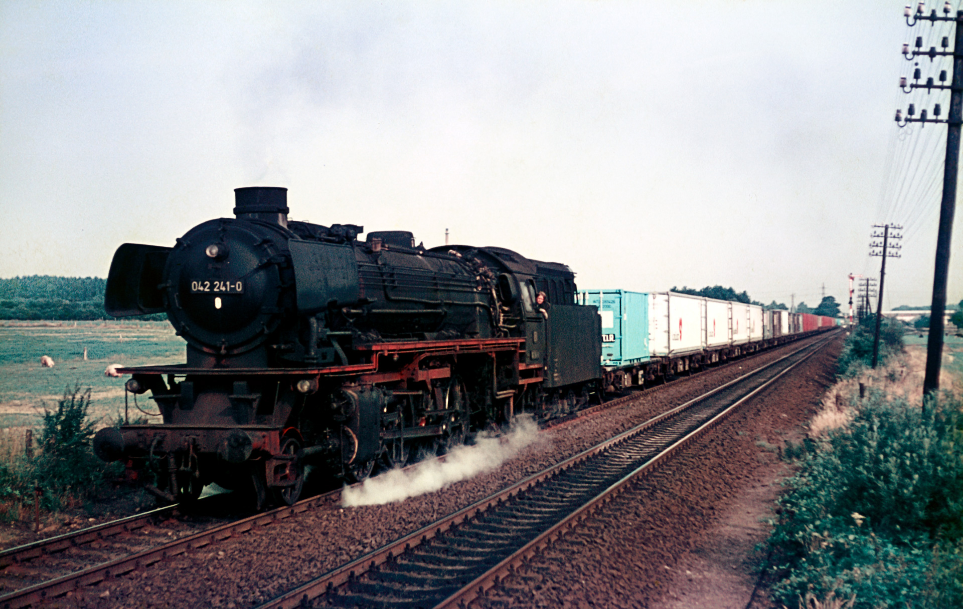 Die erste Aufnahme des Artikels – das eigentliche Artikelbild – ist schon der erste Schmankerl, zumindest für mich. Es zeigt die zu der Zeit im Bw Rheine stationierte 41 241 bzw. 042 241-0 mit einem Containerzug aus Emden kommend. 41 241 begegnete ich das erste Mal, als sie – wie später immer wieder – auf Bergischer Runde über die Müngstener Brücke mit den Oberhausenern auf Sonderfahrt unterwegs war. Schön, wenn man im betreuten Archiv Regeleinsätze einer Maschine findet, die man nur als Sonderzug-Lok kennt. Berühmtheit und ihren Beinahmen „Polarstern“ erlangte sie, als sie auf einer großen Sonderfahrt nach Narvik in Norwegen den Polarkreis überquert hat. Hier auf Bild 1 sehen wir sie einen dazu im Vergleich geradezu langweiligen Containerzug – vermutlich aus Emden – die Emslandstrecke herunter ziehen.