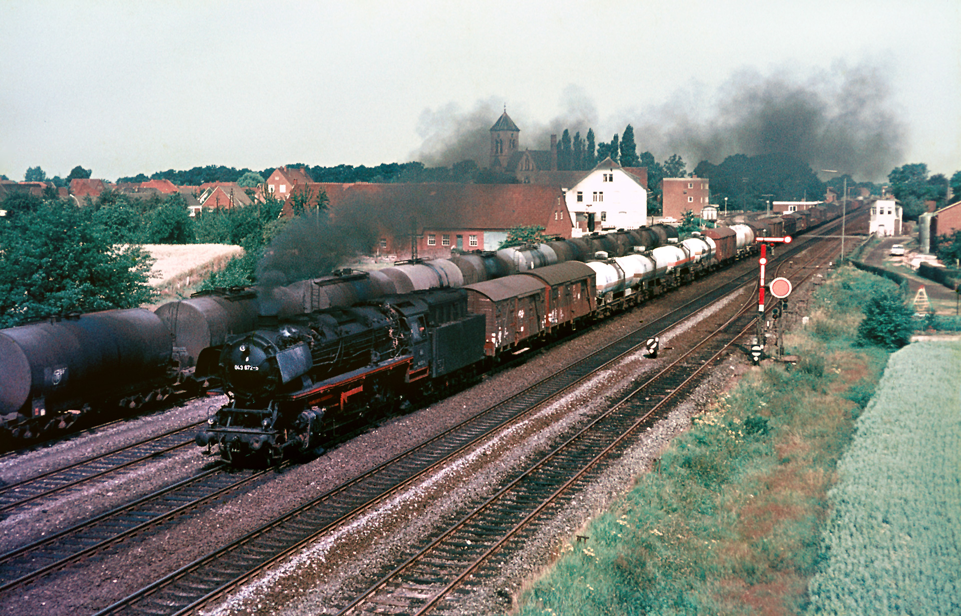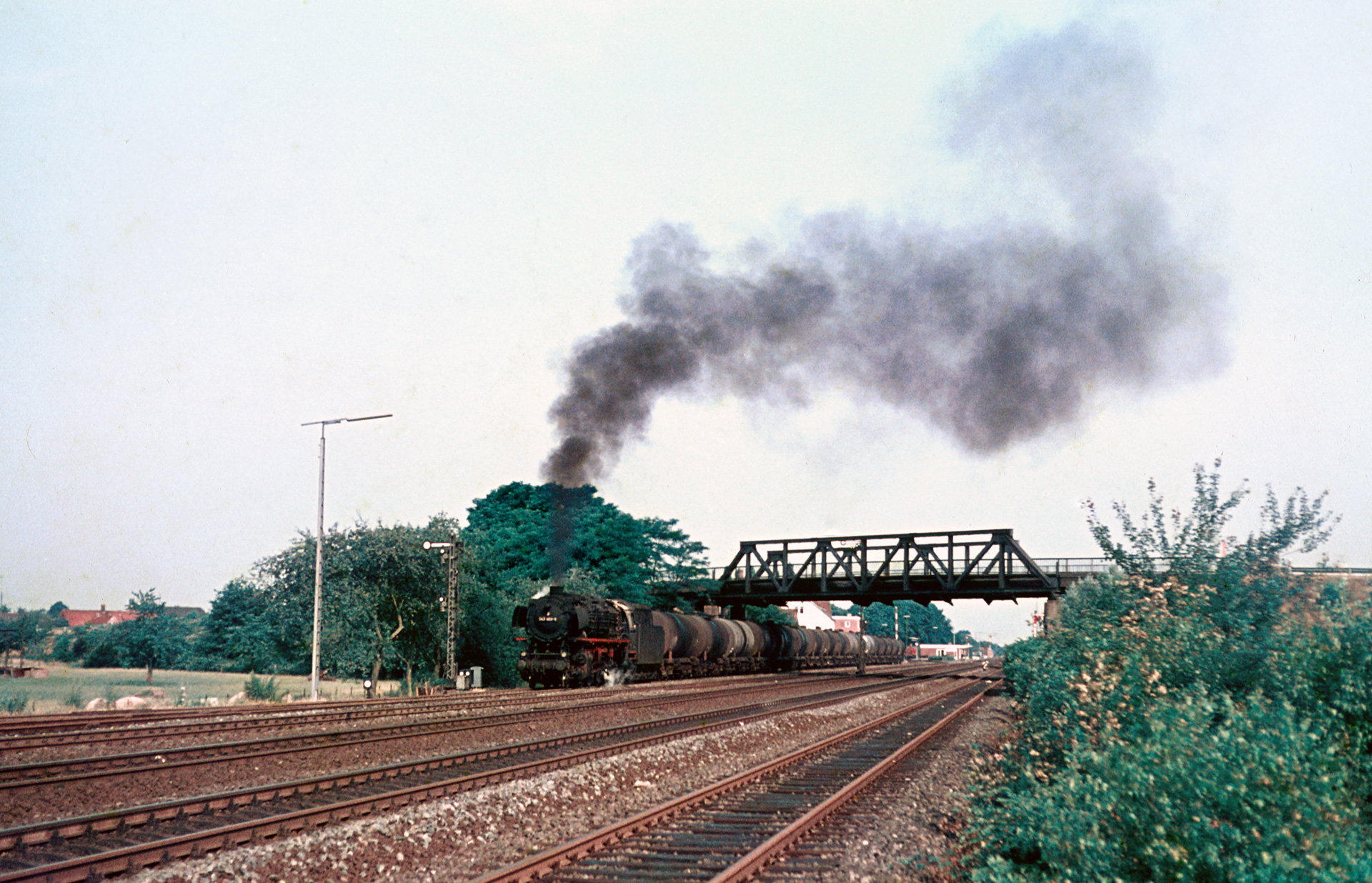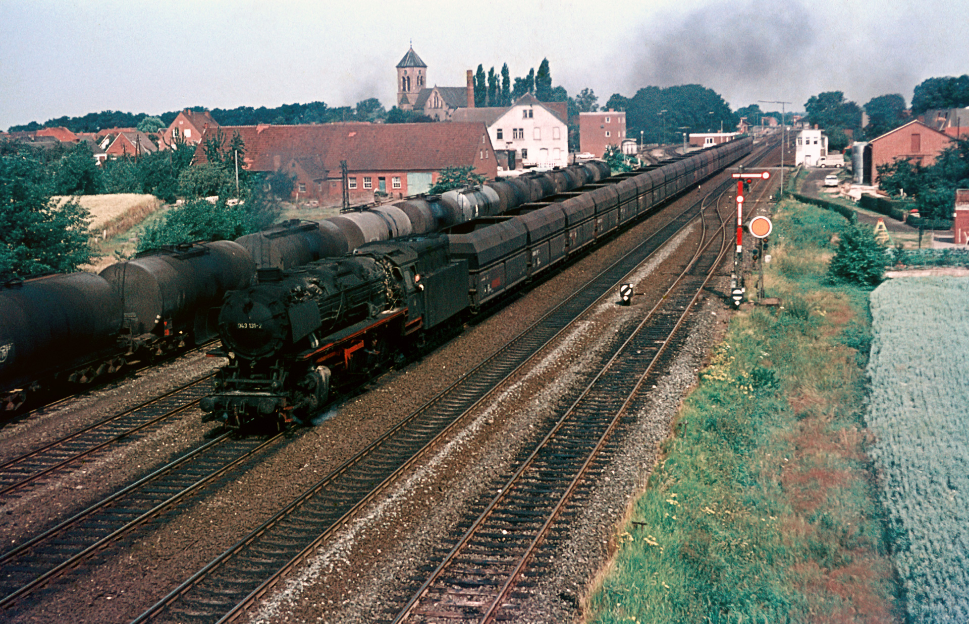 Schaut man durch die Diaserien der verschiedenen Jahre, die in Salzbergen entstanden sind, ist vor allem eins offenkundig: Die Brücke der Rheiner Str. war ein beliebter, wenn nicht der beliebteste Fotopunkt am Standort. Das verwundert auch nicht, denn man bekommt den Zug komplett auf den Film, außerdem gibt es mit Signalen und Kirchturm auch genug Beiwerk für eine anständige Bildkomposition. Deshalb sind auch im Juli 1973 einige Aufnahmen dort entstanden. Diese folgen nun.