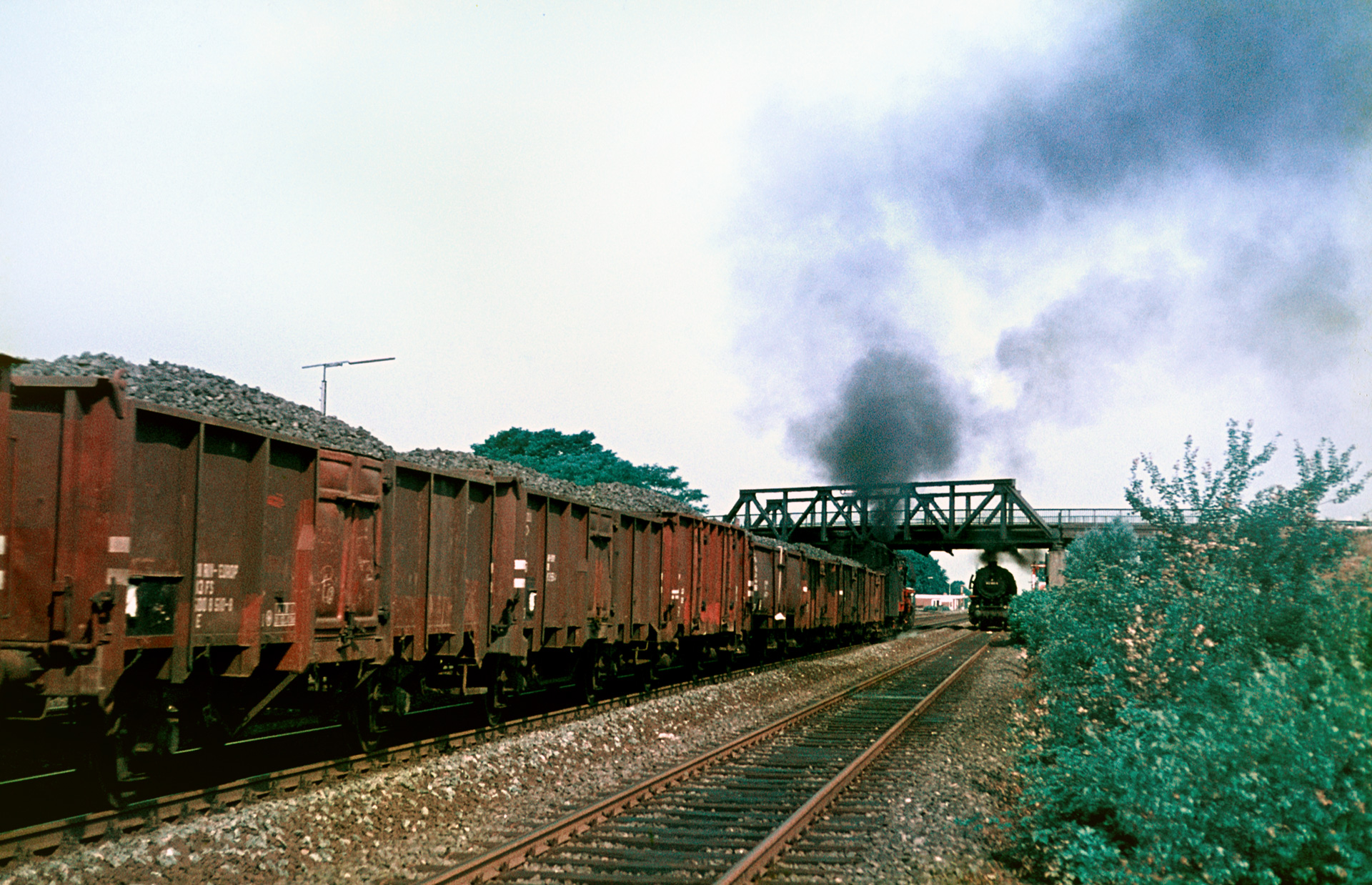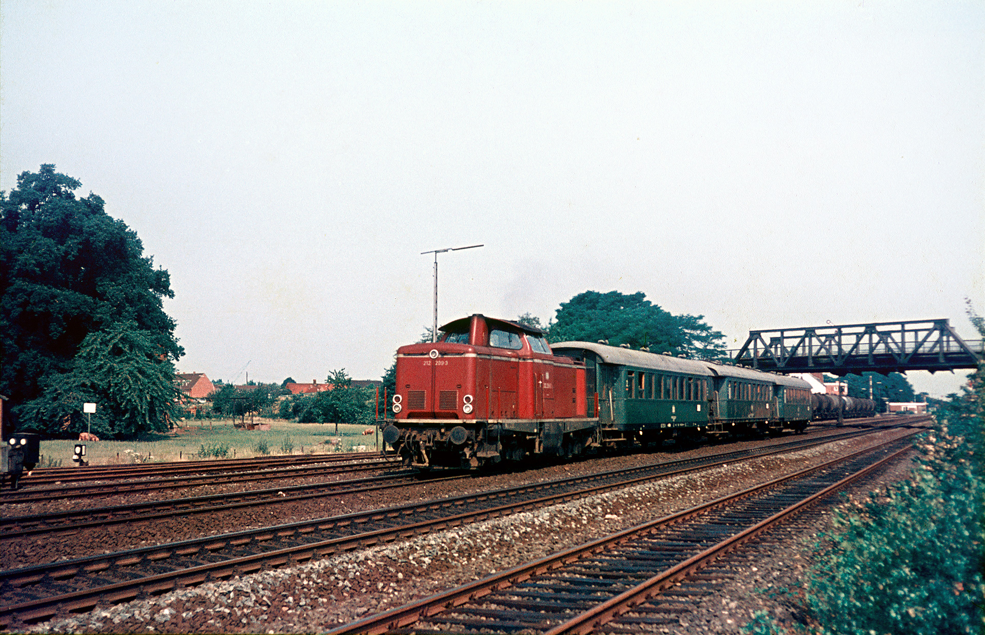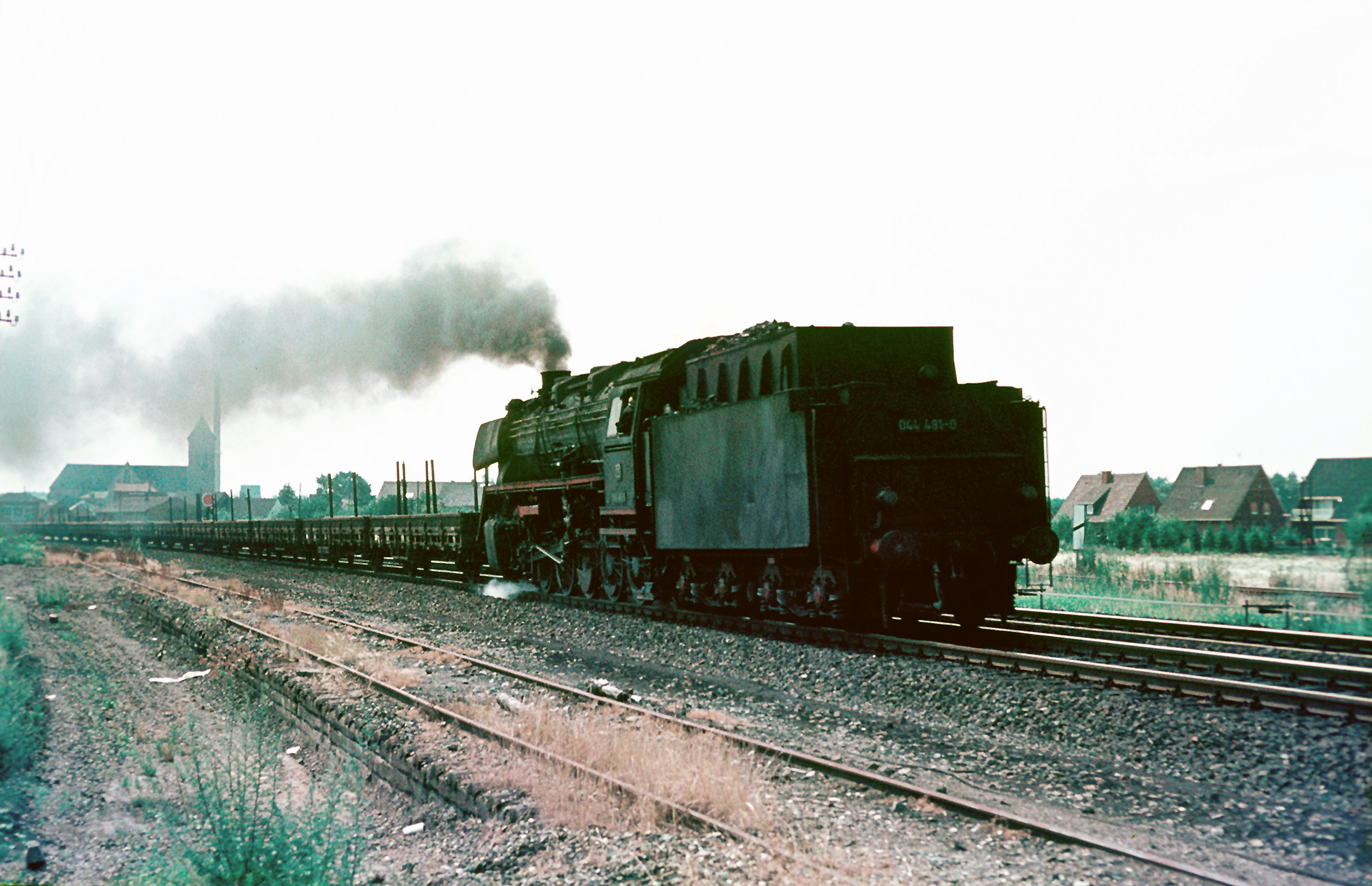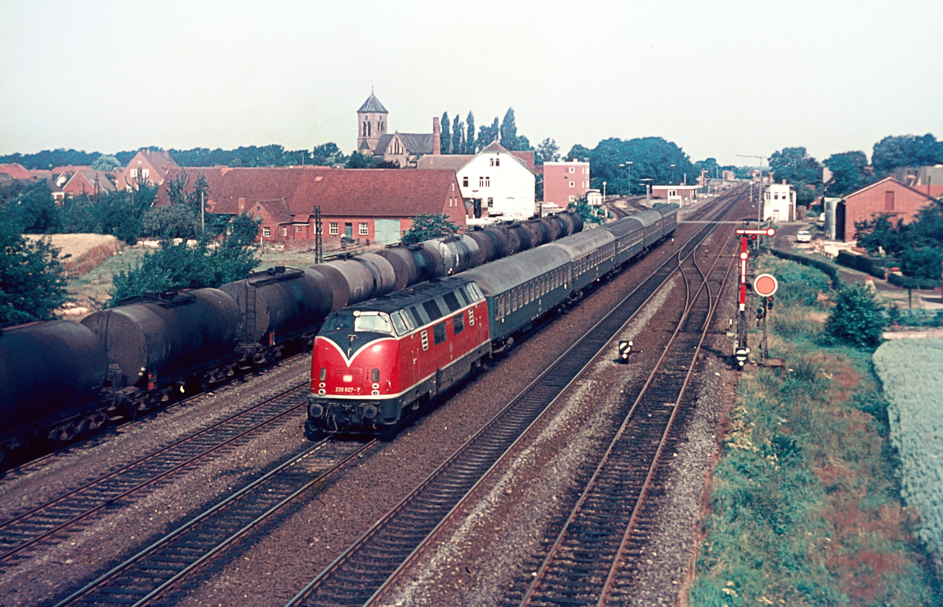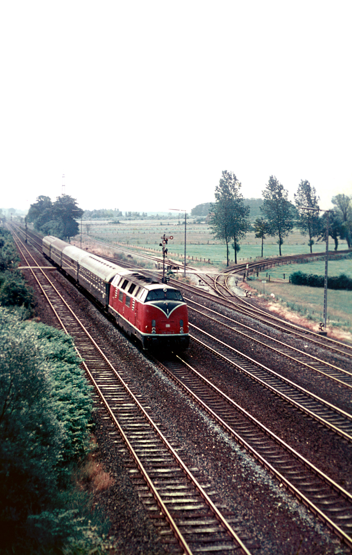 Hinsichtlich der intensiven Nutzung der Strecke mit Dampflokomotiven ist es gerade zu ein Glücksfall, dass mein Vater verschwenderisch auch bei Dieseltraktion auf den Auslöser drückte. Die Bilder sind alle von vergleichsweise guter Qualität. Ironischerweise ist es gerade jenes zweite Bild der Serie hier, wo die Loknummer schwer zu erkennen ist, aber ungeachtet jeder Stationierungsliste sehe ich die V200 220 053-3 Richtung Salzbergen fahren.